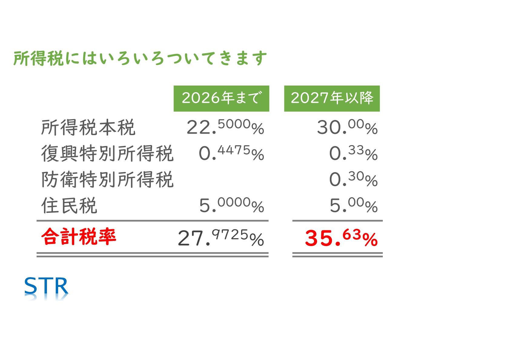 ・最低税率の引き上げ: 所得税本税が22.5%から30%に上昇(住民税等を含めると実質約35.6%) 。