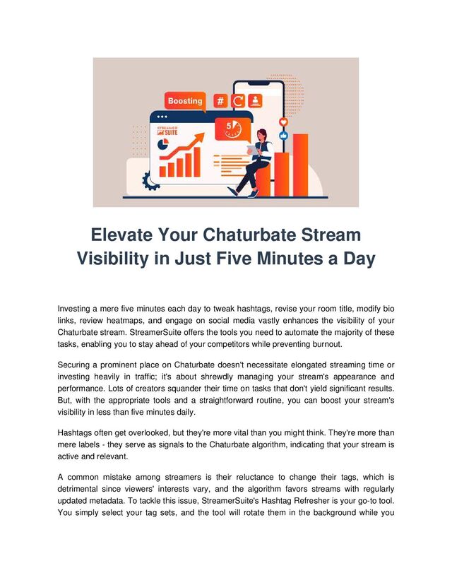 Elevating your Chaturbate stream visibility requires only a five-minute daily investment for tasks such as hashtag tweaking, room title revision, bio link modification, heatmap review, and social media engagement. StreamerSuite offers automation tools for these tasks to enhance visibility and prevent burnout. Hashtags are essential for Chaturbate's algorithm, signaling active and relevant streams. Using StreamerSuite's Hashtag Refresher tool, you can select and rotate your tag sets to boost stream freshness and discoverability. A catchy room title that reflects the stream's vibe can encourage viewer clicks. StreamerSuite's Room Title Randomizer feature helps create engaging titles quickly. Rearranging bio links can increase the likelihood of clicks on your most profitable links. StreamerSuite’s Profile Tools can help rearrange and save presets. Lastly, the Heatmaps feature in StreamerSuite visually shows where your profile is gaining traction, guiding potential adjustments to your content or pricing strategy.