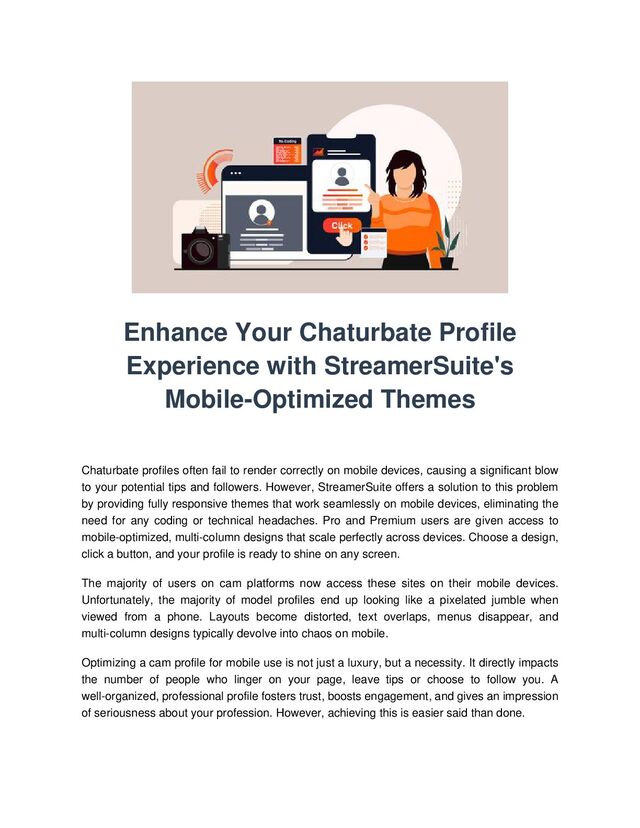 Chaturbate profiles often fail to render correctly on mobile devices, negatively impacting potential tips and followers. StreamerSuite offers a solution by providing responsive themes that work seamlessly on mobiles, eliminating technical issues. Pro and Premium users access mobile-optimized, multi-column designs that scale across devices. As most users access cam platforms on mobile devices, optimizing a profile for mobile use is essential as it affects the number of people who stay on your page, tip, or follow you. Chaturbate's profile editor wasn't designed to support responsive layouts, making it hard to scale even single-column designs. StreamerSuite was developed to deliver high-quality design options to creators without requiring them to learn coding or design theory. The team spent months researching workarounds, exploring how Chaturbate processes code, and testing layouts across devices. As a result, they created a layout system that ensures consistency every time. StreamerSuite allows users to create a well-organized, professional profile that fosters trust, boosts engagement, and gives a serious impression about their profession.