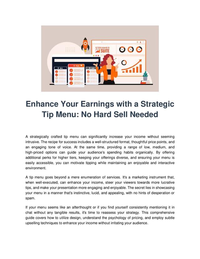 A well-structured, thoughtfully priced, and engaging tip menu can significantly enhance your income without being intrusive. Offering a range of low, medium, and high-priced options can naturally guide audience spending habits. Additional perks for higher tiers, diverse offerings, and easy accessibility can motivate tipping while maintaining an enjoyable environment. The tip menu is a marketing tool that, when well-utilized, can steer viewers towards more lucrative tips and make your presentation more engaging. If your menu appears as an afterthought or yields no results, reassess your strategy. Utilize design, understand pricing psychology, and employ subtle upselling techniques to boost income without irritating your audience. A cluttered menu can be off-putting; present a clean, neatly formatted menu to foster tipping. Use straightforward language and ensure your menu is accessible on all platforms. Use the anchoring pricing strategy and offer a range of small, medium, and large tips. Stack benefits as the price ascends to encourage viewers to upgrade their tips, effectively increasing your average tip size without coercion.
