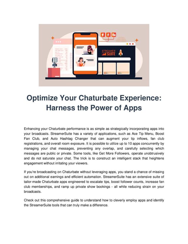 Chaturbate broadcasters can optimize their performance and earnings by strategically incorporating StreamerSuite apps into their broadcasts. Apps such as Ace Tip Menu, Boost Fan Club, Auto Hashtag Changer, and others can increase tips, fan club registrations, and overall room exposure. Users can operate up to 10 apps at once, managing their chat messages to prevent overlap and select which messages are public or private.