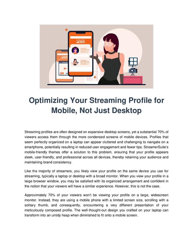 Streaming profiles often appear cluttered and difficult to navigate on mobile devices, despite looking organized on desktop screens. This discrepancy can lead to reduced user engagement and fewer tips, as around 70% of viewers access streaming profiles on mobile devices. StreamerSuite offers mobile-friendly themes to ensure profiles appear sleek, user-friendly, and professional across all devices. Most streamers view their profile on the same device they use for streaming, typically a desktop or laptop. However, this perspective differs greatly from the experience of mobile viewers who navigate the content with a single thumb on a smaller screen. Streamers often overlook the dominance of mobile viewing when establishing their online presence. Therefore, adopting a mobile-first design mentality is crucial. Despite almost 99% of streamers using a desktop or laptop for streaming, about 70% of viewers access the content via a mobile device. Streamers should consider the viewing habits of their audience when designing their profile, ensuring the mobile layout is clear and appealing within seconds. Before making changes, streamers should view their profile from the perspective of their viewers to understand the user experience.