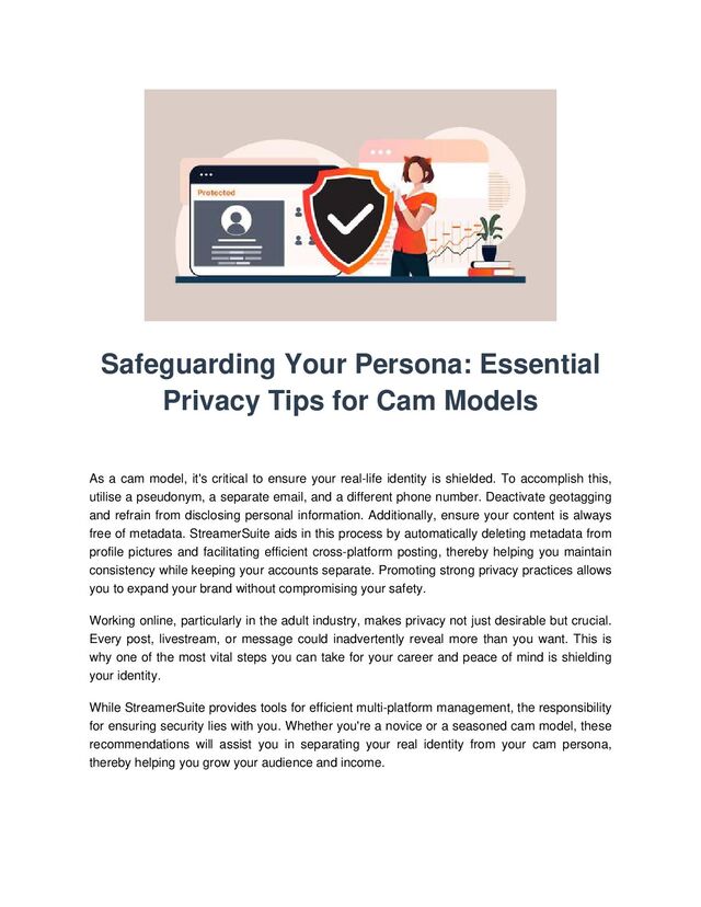 Cam models need to protect their real identity for their safety and peace of mind. To achieve this, use a pseudonym, a separate email, and a different phone number, and avoid disclosing personal details. Maintain consistency across all platforms with your chosen name. Use a work email for all cam-related activities and use a virtual number through apps like Google Voice, Burner, or Hushed. Beware of revealing too much on social media; a single geotag, username match, or accidental post from the wrong account can expose your real identity. Photos and videos often contain hidden data, such as GPS location, device type, and timestamps. StreamerSuite can help protect your privacy by automatically removing all EXIF and metadata from images you upload, ensuring no identifying information is attached to your content when it goes live. This helps avoid unintentional doxxing and maintain control over shared content. Although StreamerSuite provides tools for efficient multi-platform management, the responsibility for ensuring security ultimately lies with you. By following these recommendations, you can separate your real identity from your cam persona, helping you grow your audience and income safely.