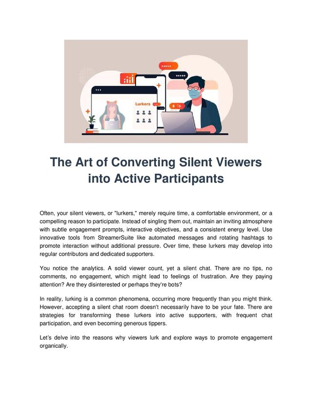 Converting silent viewers or "lurkers" into active participants in online interactions often requires time, a comfortable environment, and a compelling reason. StreamerSuite's innovative tools like automated messages and rotating hashtags can promote interaction without extra pressure, helping lurkers evolve into regular contributors. Understanding why viewers lurk is crucial; they may be introverted, watching in public or at work, merely browsing, waiting for the right moment, or freeloading. Instead of viewing lurking negatively, recognizing it as a first step towards engagement can provide valuable insights for strategic response. Encouraging interaction without pressure, using automated messages, and maintaining a welcoming atmosphere can stimulate participation. It's also important to avoid singling out lurkers or making them feel uncomfortable, as this approach could discourage them from becoming active participants. Ultimately, transforming lurkers into active supporters takes patience, understanding, and the right strategies.