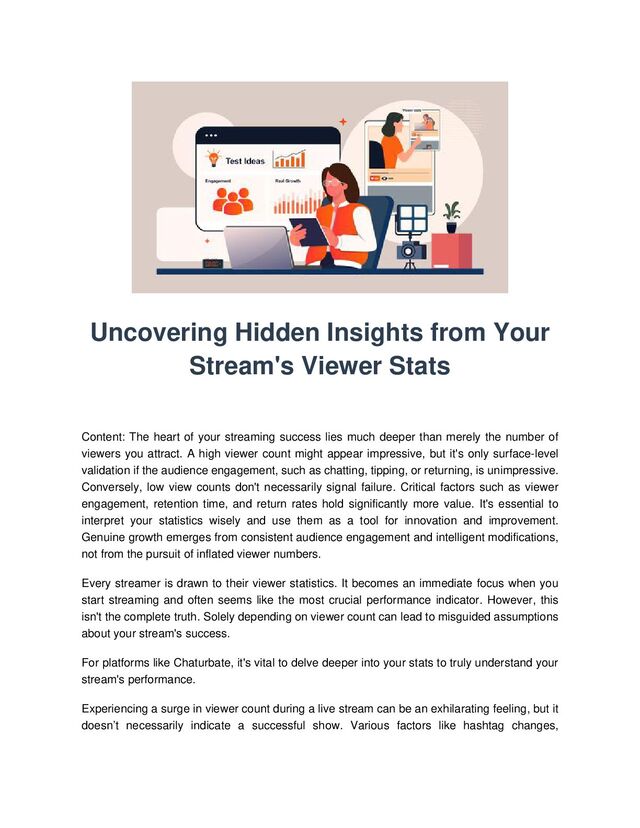 Streaming success lies deeper than just the number of viewers. High viewer counts offer surface-level validation, but true success is better measured by audience engagement such as chatting, tipping, returning, and retention time. Growth emerges from consistent audience engagement and intelligent modifications, not inflated viewer numbers. Solely depending on viewer count can lead to misguided assumptions about a stream's success. Viewer count fluctuations are common and don't necessarily represent the quality of your streaming performance. It's important to delve deeper into your stats to truly understand your stream's performance. Metrics such as average session duration can be more valuable indicators of success. If viewers are staying longer despite a lower viewer count, it indicates that your content resonates with the audience. Viewing your statistics as a toolkit for success rather than a judgement measure can lead to improvement. Experimenting with different hashtags, changing room titles, or altering your show's format can give better insights into what truly engages your audience. Ultimately, the engagement level of your core viewers is the real game-changer.
