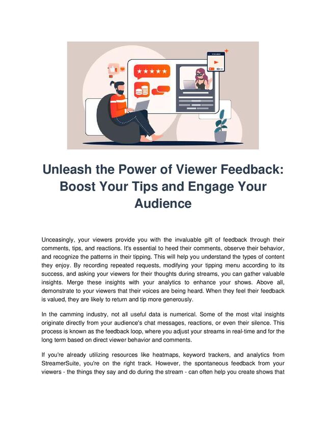 Viewer feedback is crucial in the camming industry and can be a powerful tool to enhance your shows and increase your income. By monitoring viewer comments, tips, and reactions, you can identify patterns and preferences that inform the type of content your audience enjoys. It's important to demonstrate to your viewers that their feedback is valued, encouraging them to return and tip more generously. Using tools like heatmaps, keyword trackers, and analytics from StreamerSuite can help, but spontaneous feedback during streams can offer deeper insights. By recognizing and acting on viewer feedback, you can improve your shows, build stronger connections with your audience, and generate more tips. Observing your audience during streams and monitoring chat during subtle variations in your show can help identify successful tweaks. Keeping a "Viewer Feedback List" can help track recurring comments and identify emerging patterns. Your tip menu can also serve as a feedback loop, with repeated tipping for certain items indicating what your audience values. By replacing underperforming items and experimenting with new ones, you can refine your offerings based on viewer feedback.