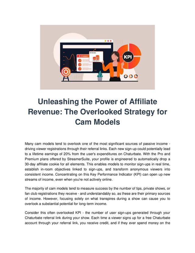 Cam models often underestimate the potential of affiliate revenue as a source of passive income. By driving viewer registrations through referral links, cam models can earn a consistent 20% from a user's expenditures on platforms like Chaturbate. StreamerSuite's Pro and Premium plans automate this process, dropping a 30-day affiliate cookie and enabling real-time monitoring of sign-ups. This allows cam models to establish in-room objectives related to sign-ups and convert anonymous viewers into regular income, even when they're not online. While tips, private shows, and fan club registrations are common income sources, focusing on them alone overlooks the long-term income potential of affiliate revenue. If a viewer signs up for a free Chaturbate account through a model's referral link, they receive a 20% cut of that viewer's spendings on the platform for life. StreamerSuite equips profiles with built-in theme monetization, making every element clickable and dropping an affiliate cookie with each click. This passive income source is continuous and can provide revenue even during off days, offering a steady stream of income as long as users remain active on the platform.
