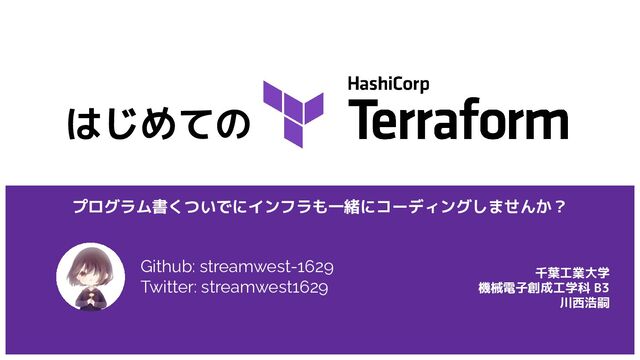 はじめての プログラム書くついでにインフラも一緒にコーディングしませんか? 千葉工業大学 機械電子創成工学科 B3 川西浩嗣 Github: streamwest-1629 Twitter: streamwest1629