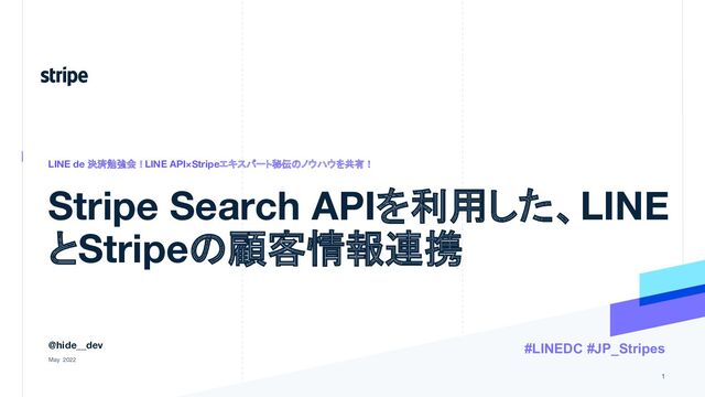 ORなどを利用した検索に 対応したAPI • 対応リソース: ◦ Payment Intents (支払) ◦ Customers (顧客) ◦ Invoices (請求書) ◦ Prices (料金) ◦ Products (商品) ◦ Subscriptions (サブスク) ◦ etc… 9 Stripe Search APIを利用した、LINEとStripeの顧客情報連携 export const getMonthlyCustomerSucceededPayment = async (customerId) => { const targetMonth = dayjs() const result = await stripe.paymentIntents.search({ query: [ `created>${targetMonth.startOf('month').unix()}`, 'AND', `created<${targetMonth.endOf('month').unix()}`, 'AND', `customer:"${customerId}"`, 'AND', `status:"succeeded"`, 'AND', 'currency:"JPY"', ].join(' '), }) return result } #LINEDC #JP_Stripes