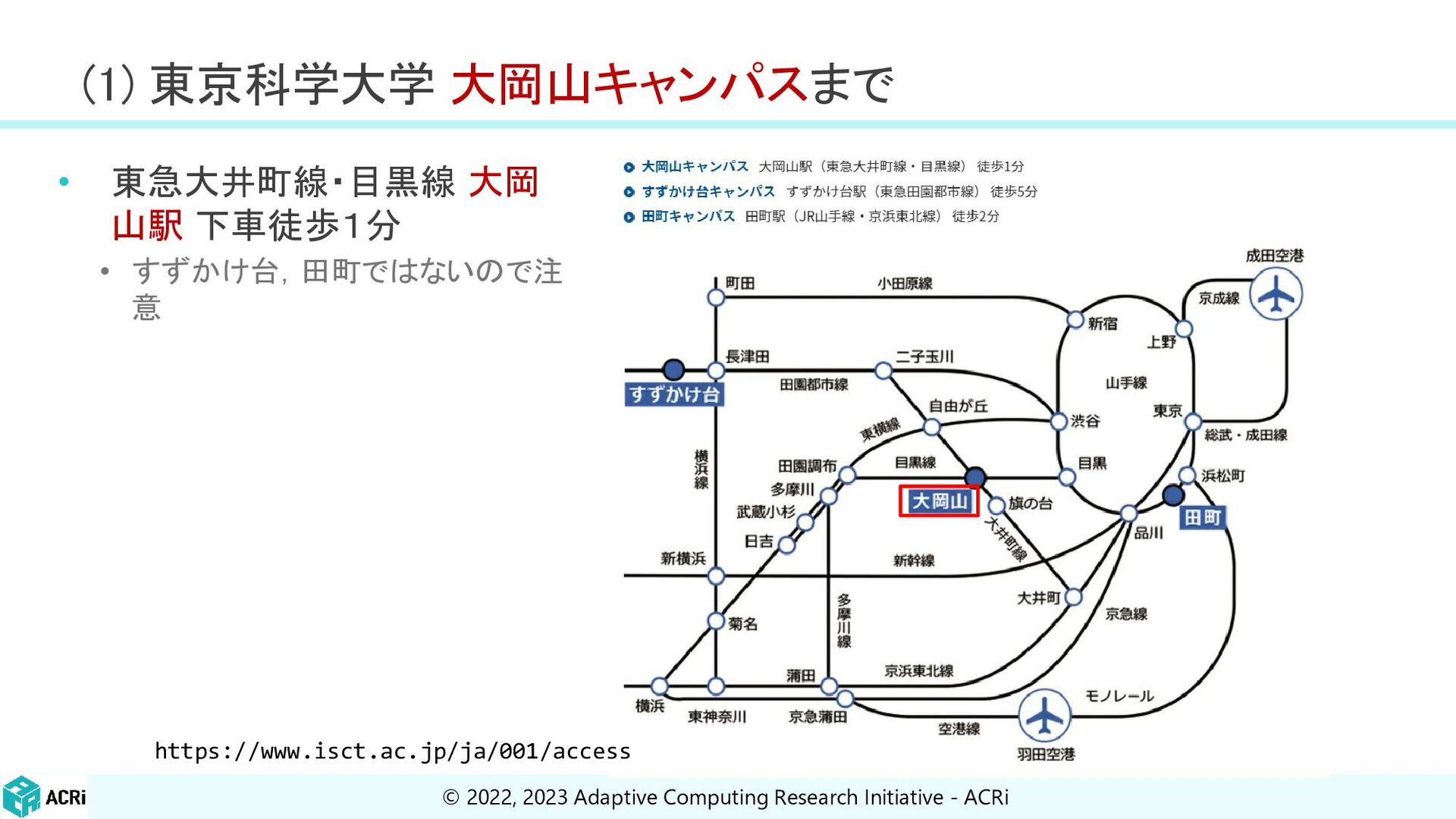 東京科学大学 大岡山キャンパスまで • 東急大井町線・目黒線 大岡 山駅 下車徒歩1分 • すずかけ台,田町ではないので注 意 https://www.isct.ac.jp/ja/001/access