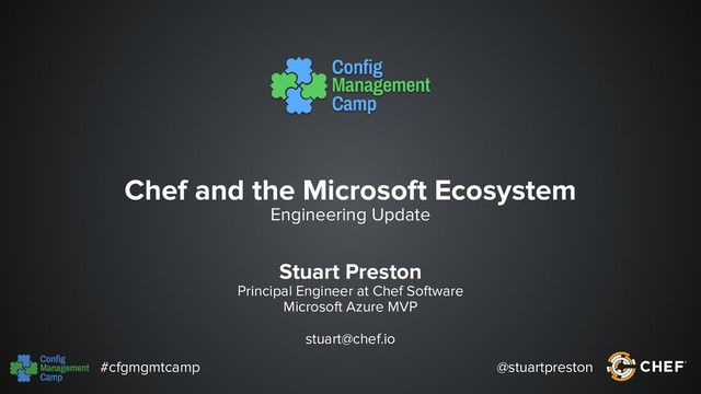7/2008 (yay!) • No more 32 bit installations (please!) • Policyfile workflow gaining on Chef Server workflow and move into Habitat • PowerShell Core 6 support (think: powershell_script on Linux) • The end of the Windows cookbook? Expect more announcements between now and ChefConf (May 20-23, Seattle)