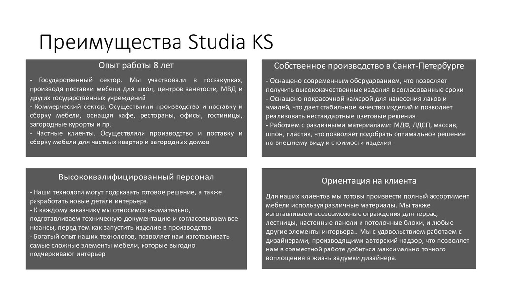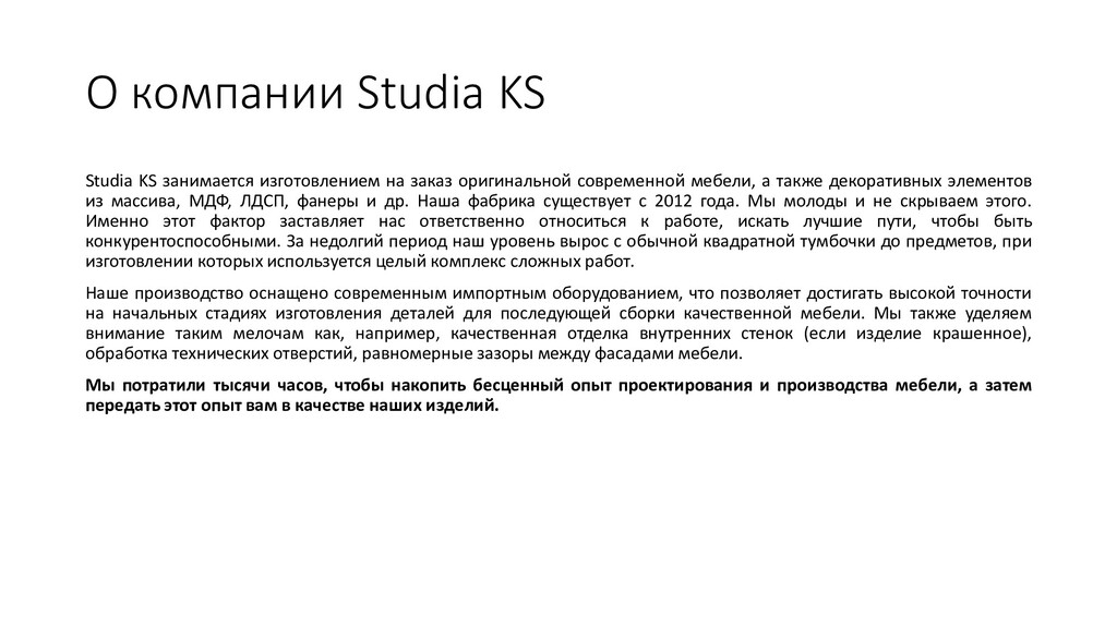 Studia KS занимается производством мебели с 2012 года. За это время мы накопили обширный опыт. Мы закупили новое и усовершенствовали имеющееся оборудование и собрали команду высококвалифицированных специалистов. Всё это помогает нам изготавливать мебель высочайшего качества и в соответствии со сроками.