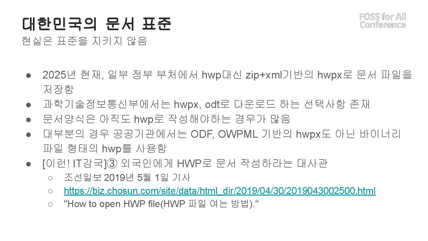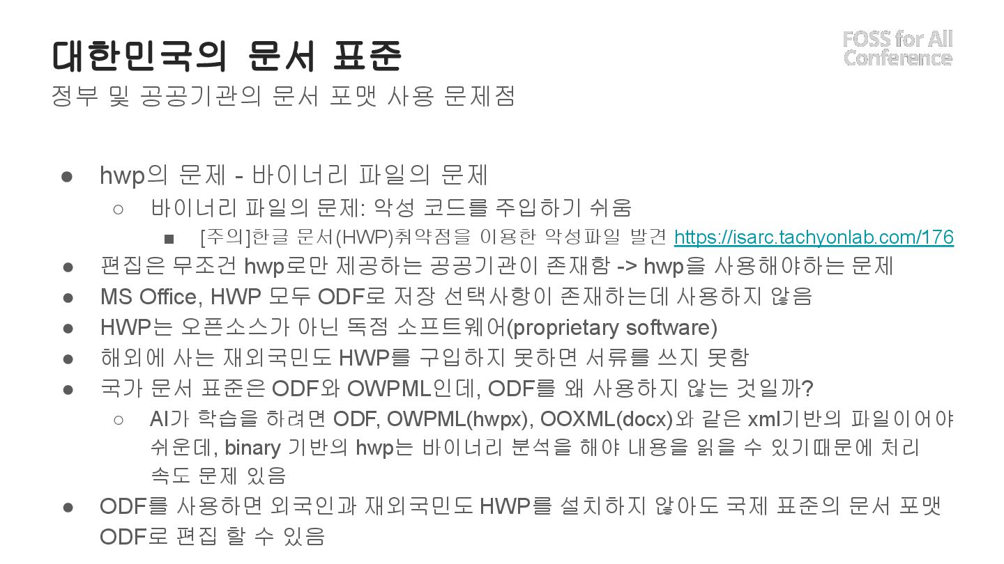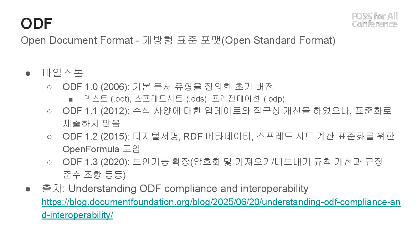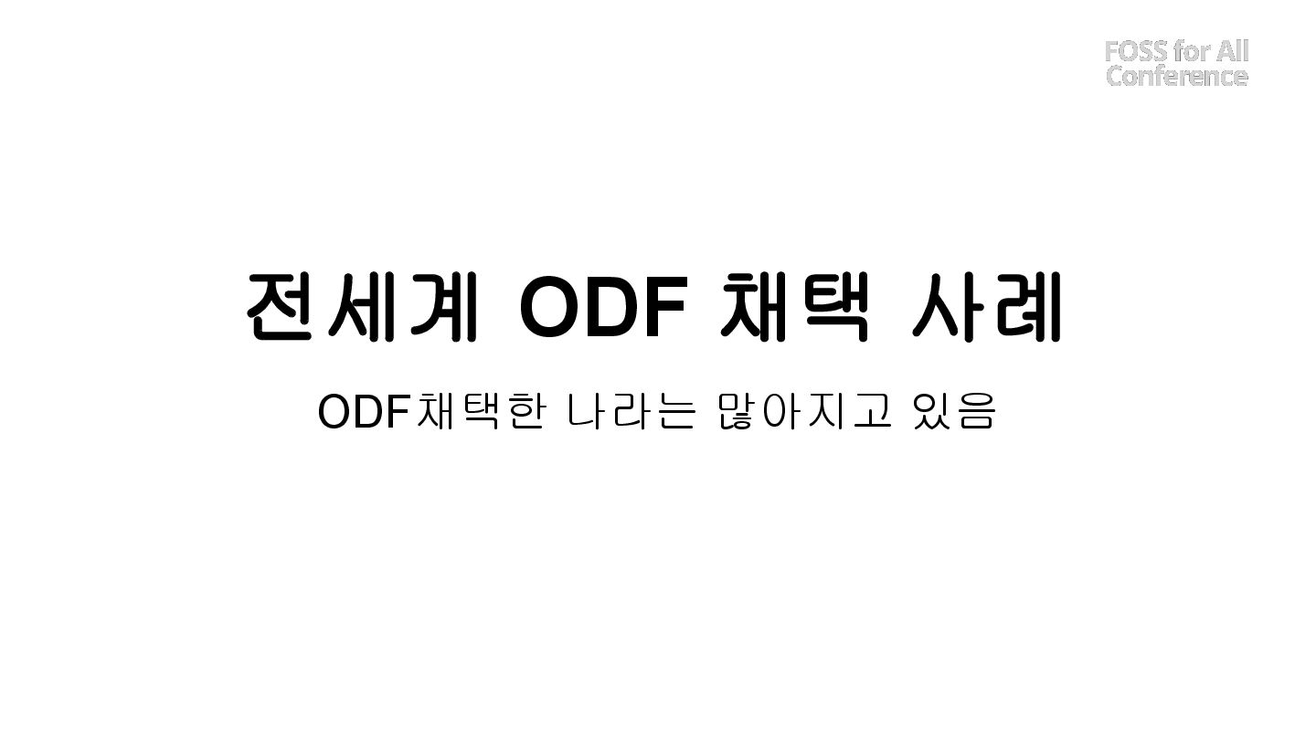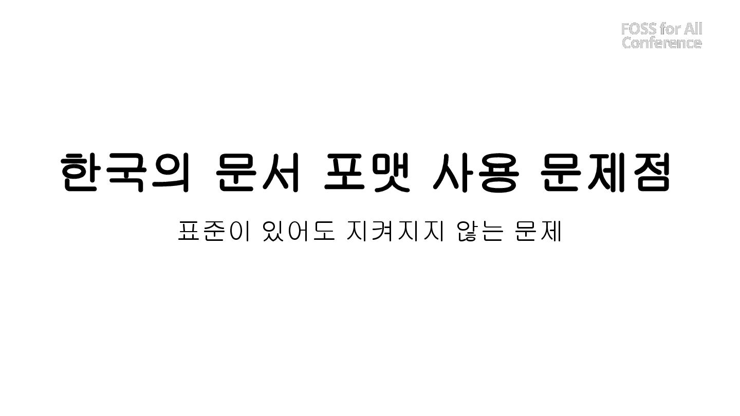 대한민국의 문서 표준 현황을 다루며, 왜 ODF가 중요한지, 폐쇄적 포맷(OOXML, HWP등)과의 차이점, 그리고 공공기관에서의 도입 필요성에 대해서도 소개하겠습니다