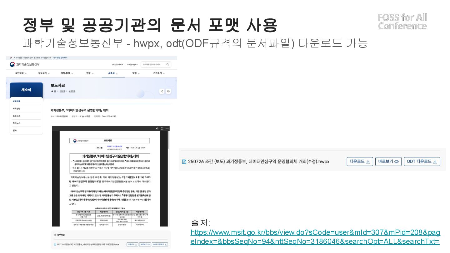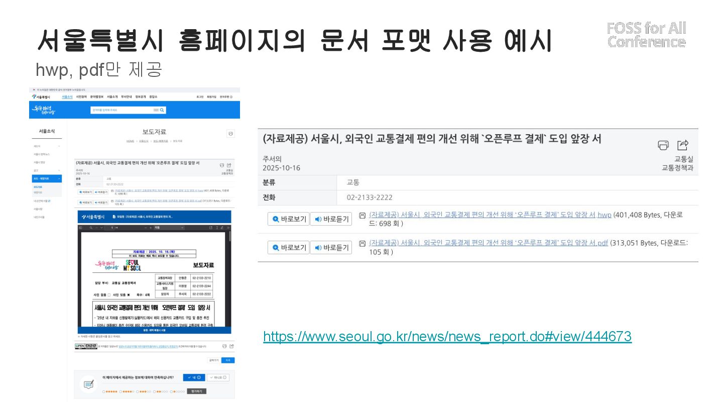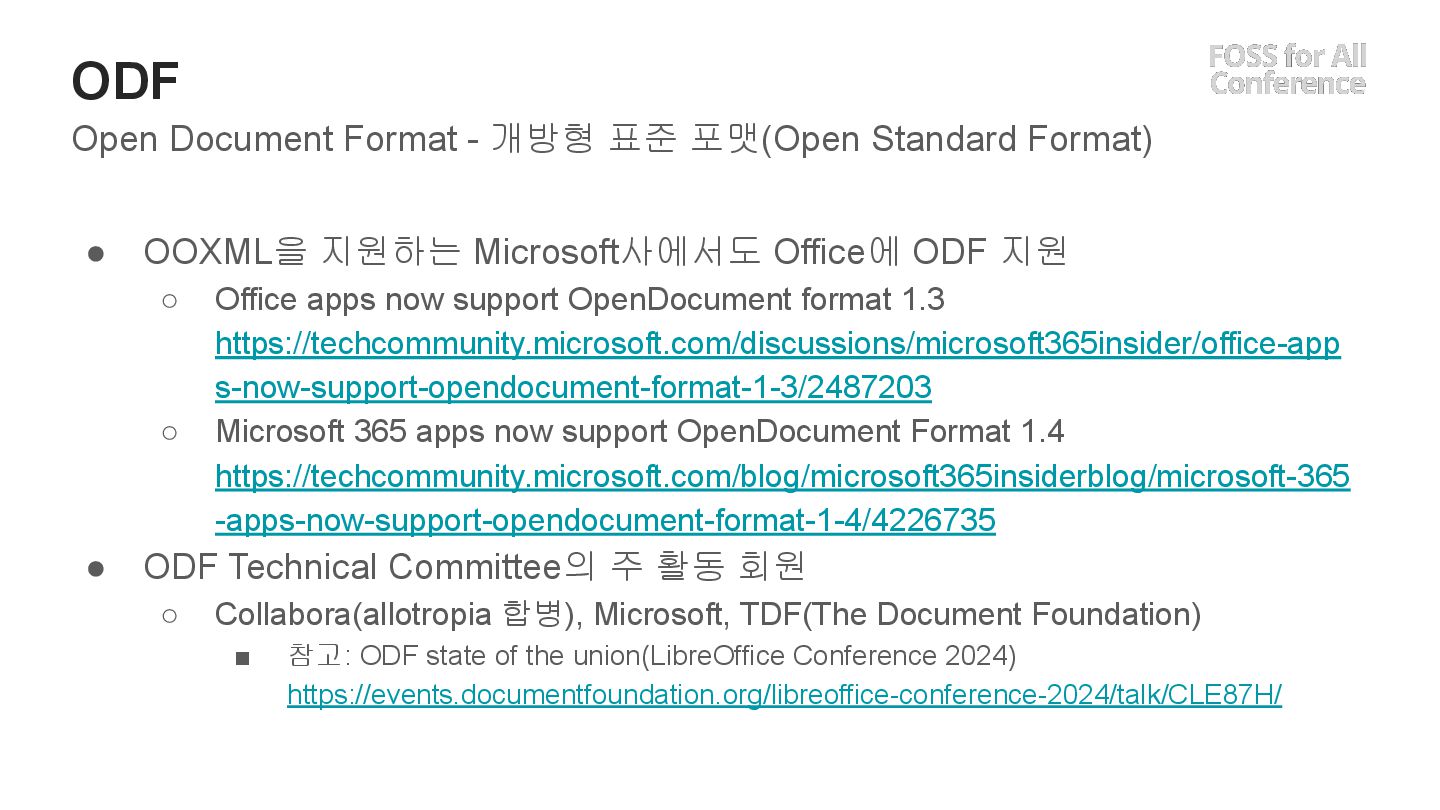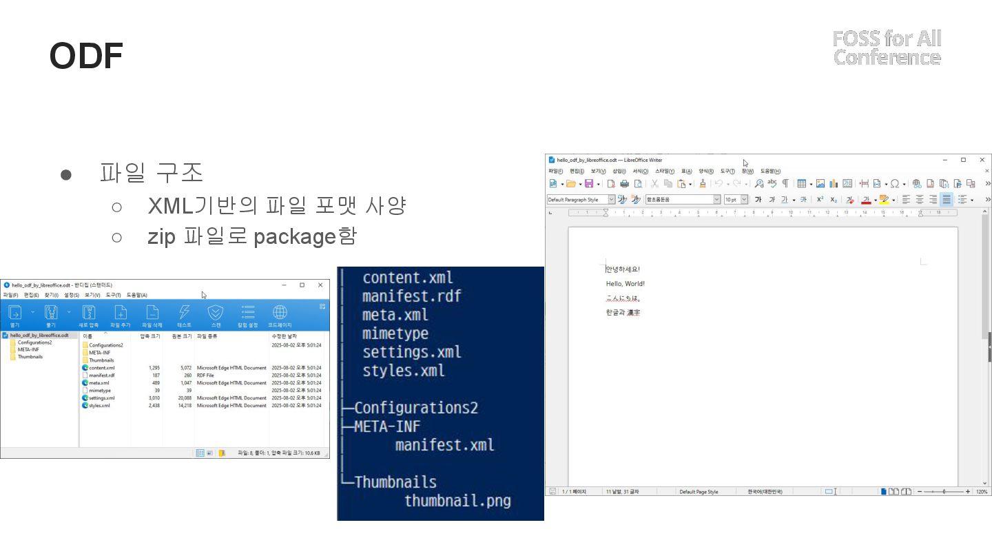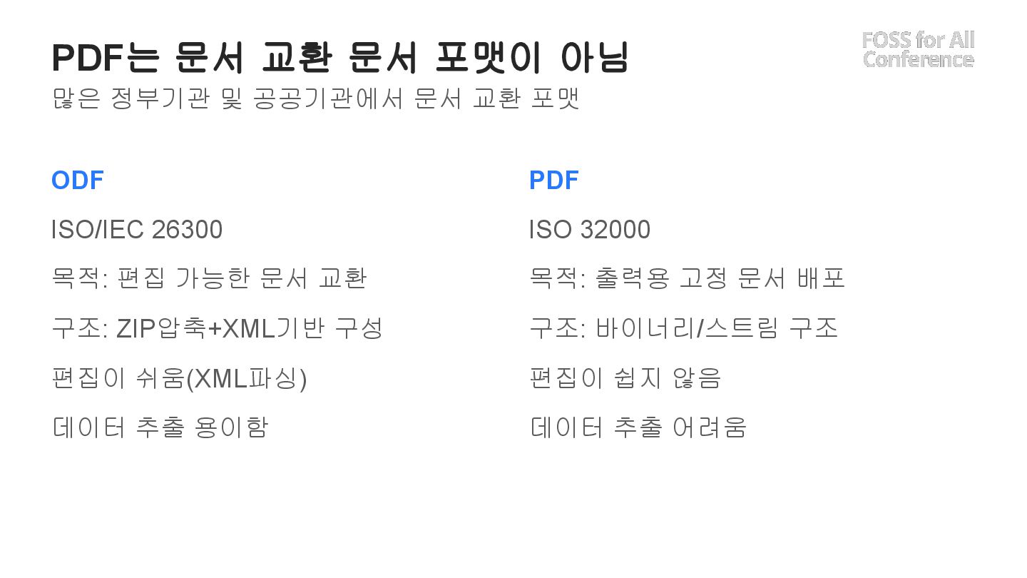 대한민국의 문서 표준 현황을 다루며, 왜 ODF가 중요한지, 폐쇄적 포맷(OOXML, HWP등)과의 차이점, 그리고 공공기관에서의 도입 필요성에 대해서도 소개하겠습니다