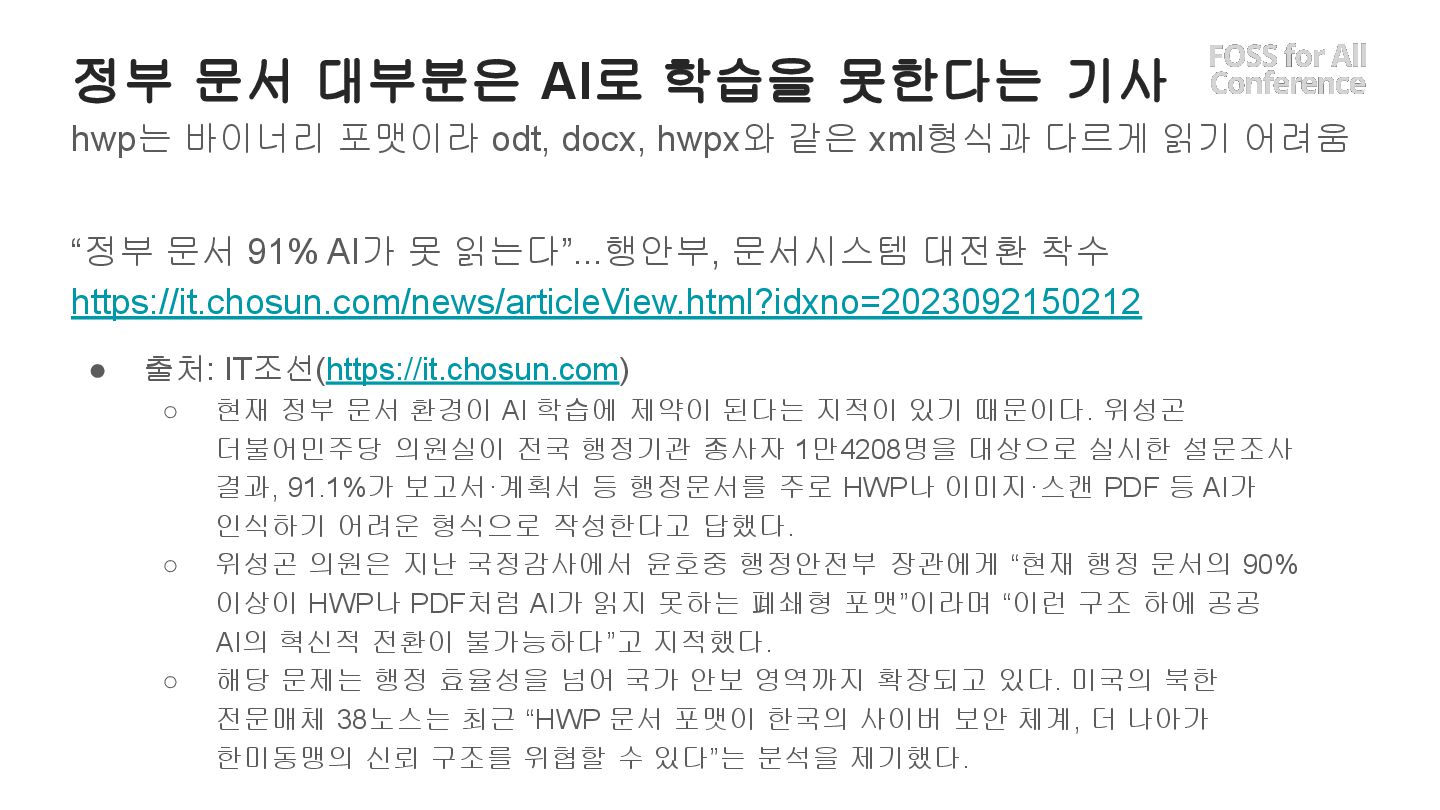 AI시대에 기계가 읽을 수 있는 문서 포맷(machine readable format)이 왜 중요한지 이야기 하면서 hwp의 한계도 이야기 하겠습니다.