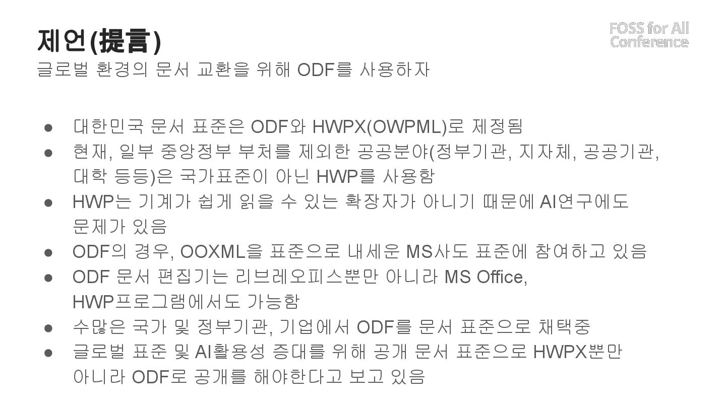 최종적으로, 글로벌 표준 및 AI 활용성 증대를 위해 ODF 사용을 촉구하고, 한국에서 실질적 ODF 사용 확산의 계기가 마련되었으면 합니다.