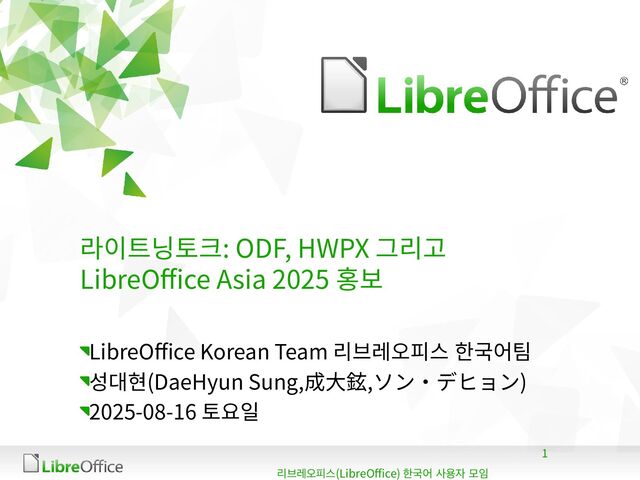 라이트닝토크(Lightning Talk): ODF, HWPX 그리고 LibreOffice Asia 2025 홍보