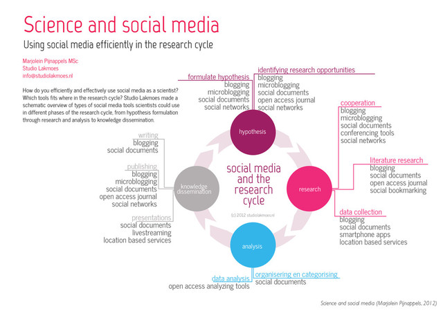 How do you efficiently and effectively use social media as a scientist? Which tools fits where in the research cycle? Studio Lakmoes made a schematic overview of types of social media tools scientists could use in different phases of the research cycle, from hypothesis formulation through research and analysis to knowledge dissemination.