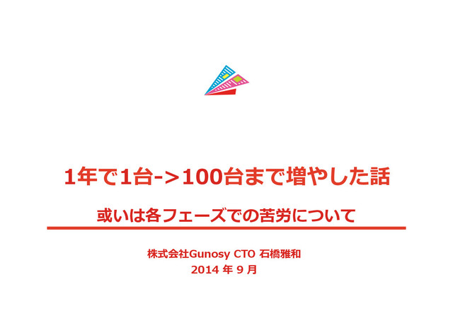 1年年で1台-‐‑‒>100台まで増やした話 或いは各フェーズでの苦労について 株式会社Gunosy CTO ⽯石橋雅和 2014 年年 9 ⽉月