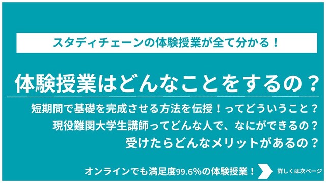 受験を考えている生徒の方、保護者の方に向けてスタディチェーンの無料体験授業の内容を分かりやすく端的に紹介しています。