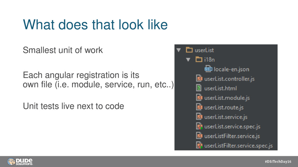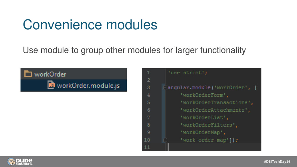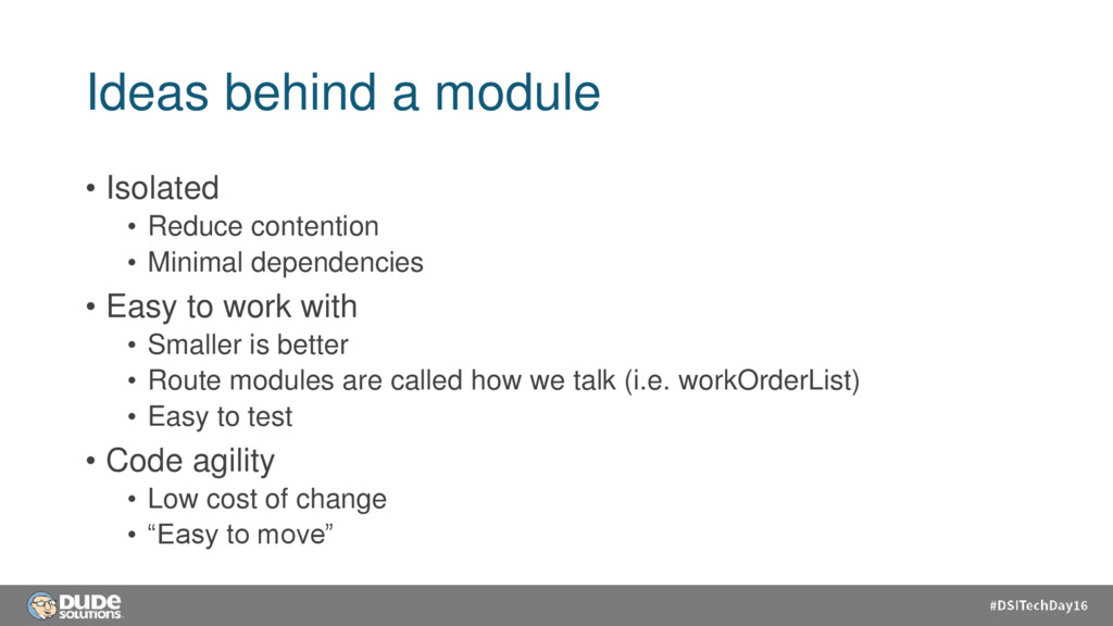 Minimal dependencies • Easy to work with • Smaller is better • Route modules are called how we talk (i.e. workOrderList) • Easy to test • Code agility • Low cost of change • “Easy to move”