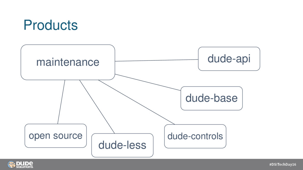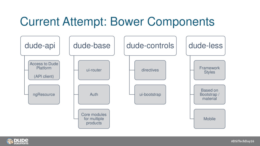 client) ngResource dude-base ui-router Auth Core modules for multiple products dude-controls directives ui-bootstrap dude-less Framework Styles Based on Bootstrap / material Mobile