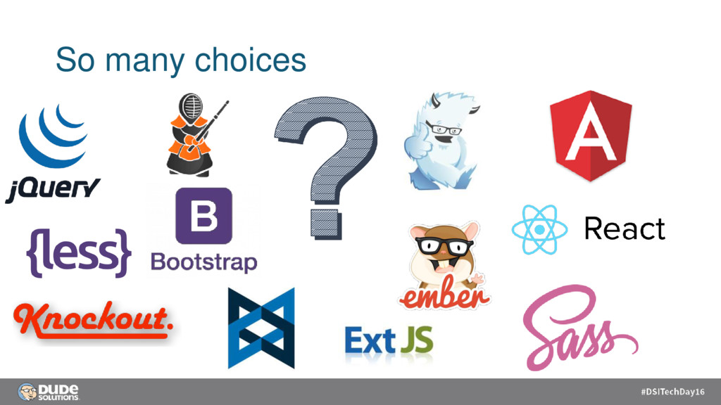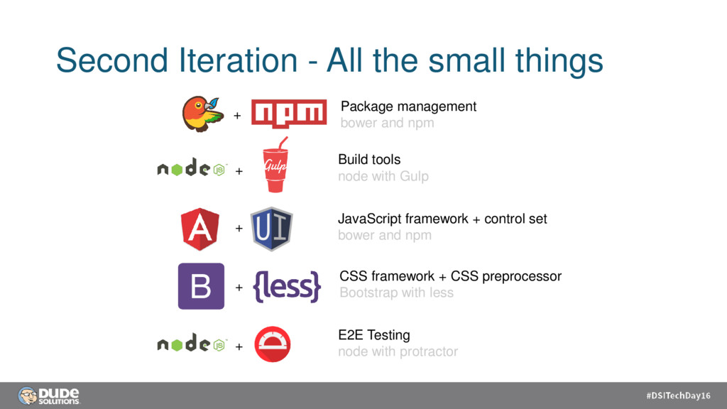 and npm Build tools node with Gulp JavaScript framework + control set bower and npm CSS framework + CSS preprocessor Bootstrap with less + + + + + E2E Testing node with protractor
