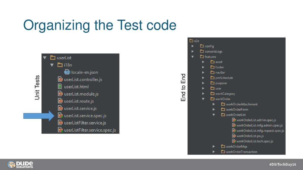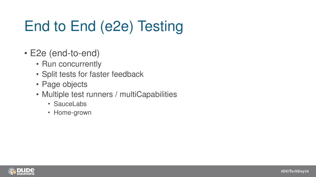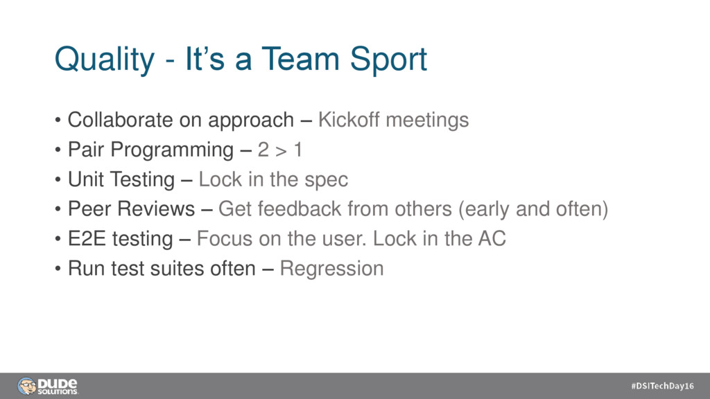 – Kickoff meetings • Pair Programming – 2 > 1 • Unit Testing – Lock in the spec • Peer Reviews – Get feedback from others (early and often) • E2E testing – Focus on the user. Lock in the AC • Run test suites often – Regression
