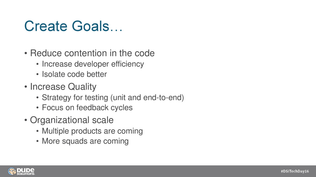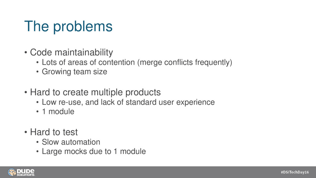 contention (merge conflicts frequently) • Growing team size • Hard to create multiple products • Low re-use, and lack of standard user experience • 1 module • Hard to test • Slow automation • Large mocks due to 1 module