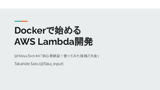 Dockerで始める AWS Lambda開発 @Hibiya.Tech #4 「初心者歓迎!使ってみた技術 LT大会」 Takahide Sato (@Taka_input)