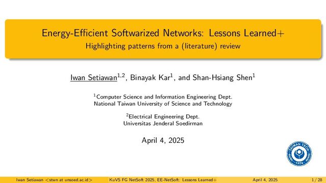 the Edge • Emerging softwarized network scenarios at the edge • Various emerging scenarios from WBANs, IoT, to non-terrestrial, e.g., UAV and satellite • Edge networking (interconnection) converged with computing (collaborative cloud-edge) • Multiple/massive end-devices and edge services with stringent latency +caching • Edge wireless networks, e.g., dense RANs, D2D, NOMA, MEC, RAN/radio slicing Network Reconfiguration and Sharing • Dynamic network scenarios: scalability, e.g., green TE, video streaming, security defense • Techniques: consolidation/aggregation, resource/function migration, load shifting, etc. • Flexibility vs stability; is slow response better in terms of energy efficiency? • Network (+compute) resource/function sharing, e.g., inter-DC resources, CNFs, serverless • Prediction to anticipate utilization+power consumption. Reactive vs proactive reconfig. Iwan Setiawan <stwn at unsoed.ac.id> KuVS FG NetSoft 2025, EE-NetSoft: Lessons Learned+ April 4, 2025 23 / 28