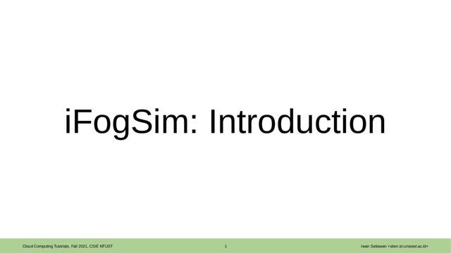 <stwn at unsoed.ac.id> References [1] C. Chang, S. N. Srirama, and R. Buyya, “Internet of things (IoT) and new computing paradigms,” in Fog and Edge Computing: Principles and Paradigms, 1st ed. Wiley, 2019. [2] R. Mahmud and R. Buyya, “Modeling and simulation of fog and edge computing environments using iFogSim toolkit,” in Fog and Edge Computing: Principles and Paradigms, 1st ed. Wiley, 2019. [3] H. Gupta, A. Vahid Dastjerdi, S.K. Ghosh, and R. Buyya, “iFogSim: A toolkit for modeling and simulation of resource management techniques in the internet of things, edge and fog computing environments,” Software: Practice and Experience, vol. 47, no. 9, pp. 1275-1296, 2017. [4] A. Singh, “iFogsim project structure: a beginners guide,” 2021. [Online]. Available: https://cloudsimtutorials.online/ifogsim-project-structure-a-beginners-guide/