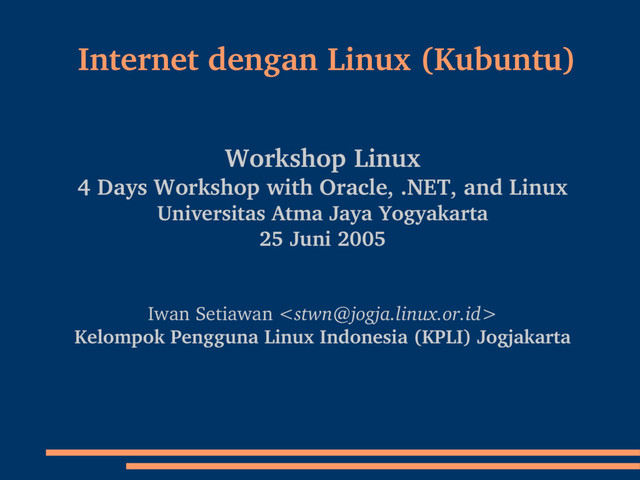 Oracle, .NET, and Linux Universitas Atma Jaya Yogyakarta 25 Juni 2005 Iwan Setiawan <[email protected]> Kelompok Pengguna Linux Indonesia (KPLI) Jogjakarta