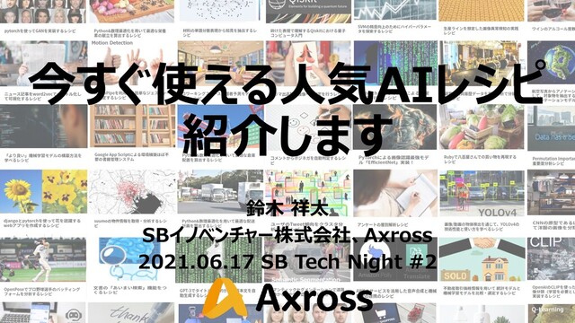今すぐ使える人気AIレシピ 紹介します 鈴木 祥太 SBイノベンチャー株式会社、Axross 2021.06.17 SB Tech Night #2