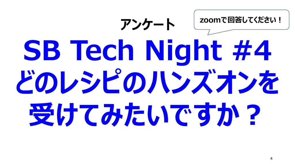 アンケート SB Tech Night #4 どのレシピのハンズオンを 受けてみたいですか? 4 zoomで回答してください!