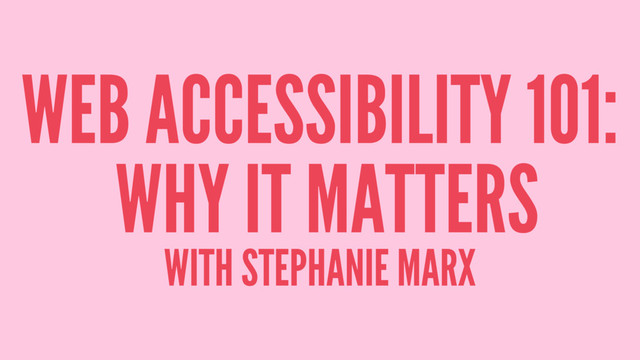 What if you had launched a new website, and due to an error in code, 1 in 5 users couldn't access it? This isn't hyperbole; 1 in 5 Americans live with a disability. Furthermore, studies show that people with disabilities are significantly less likely than adults without disabilities to go online at all. As technology has grown, using the web has shifted from being a luxury to being a necessity, so accessible web sites are of paramount importance. In this talk, we'll discuss the basics of how to accommodate users with a wide variety of disabilities, such as visual impairment, dyslexia, and vestibular disorders. This talk assumes a basic knowledge of HTML5 and CSS3, and discusses both code and visual design.