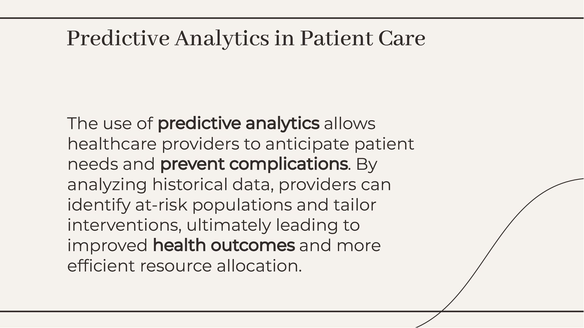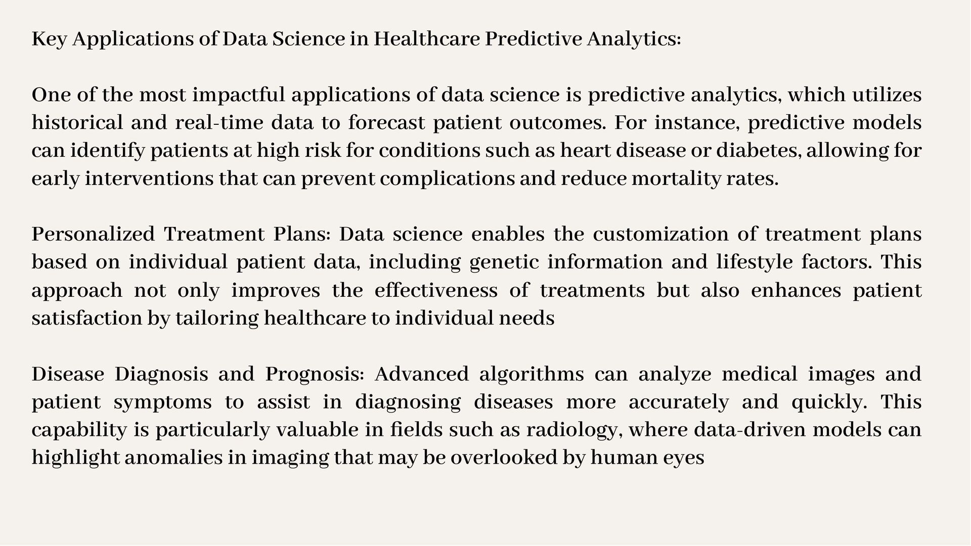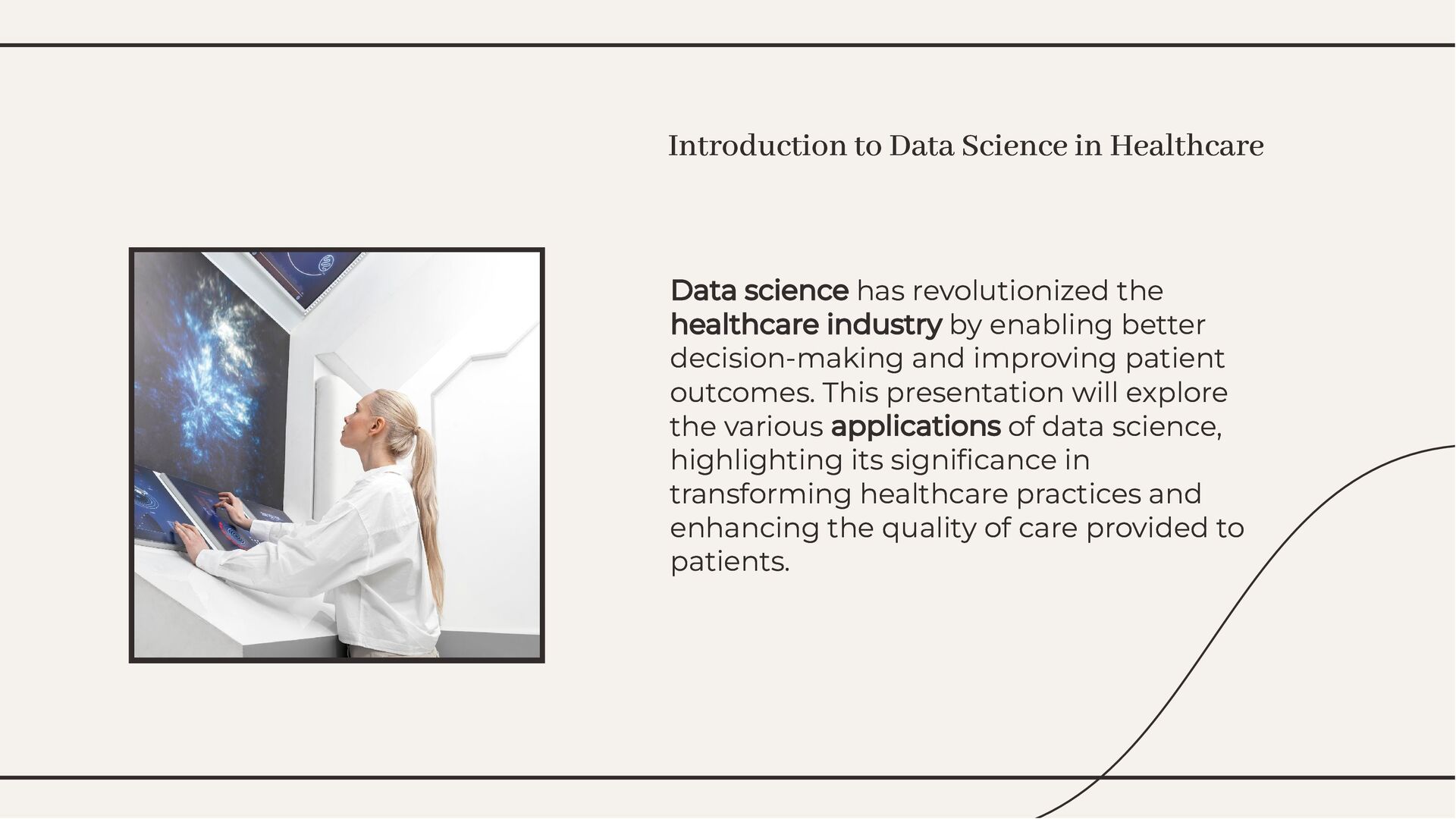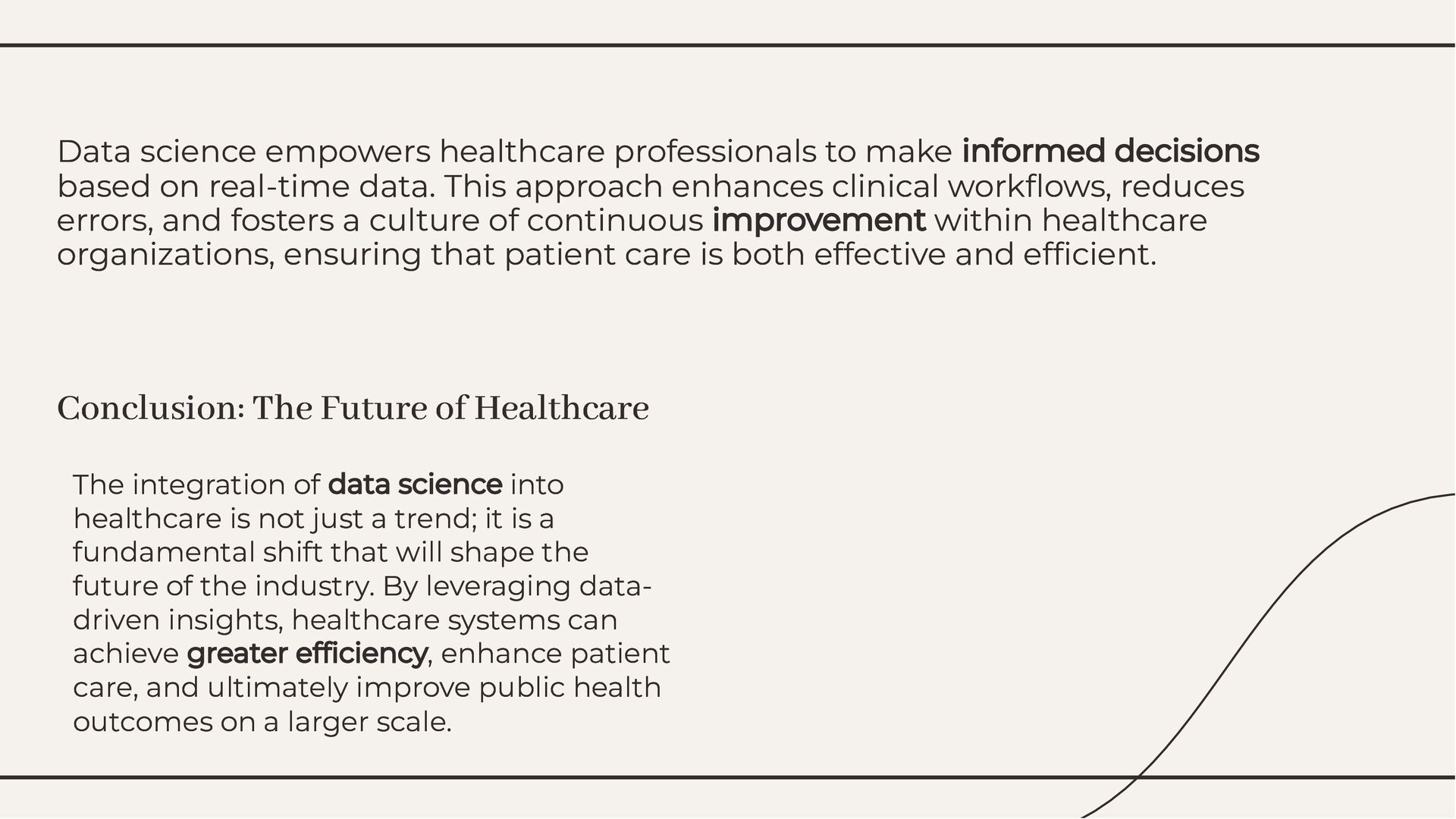 on real-time data. This approach enhances clinical workflows, reduces errors, and fosters a culture of continuous improvement within healthcare organizations, ensuring that patient care is both effective and efficient. Data science empowers healthcare professionals to make informed decisions based on real-time data. This approach enhances clinical workflows, reduces errors, and fosters a culture of continuous improvement within healthcare organizations, ensuring that patient care is both effective and efficient. The integration of data science into healthcare is not just a trend; it is a fundamental shift that will shape the future of the industry. By leveraging data- driven insights, healthcare systems can achieve greater efficiency, enhance patient care, and ultimately improve public health outcomes on a larger scale. The integration of data science into healthcare is not just a trend; it is a fundamental shift that will shape the future of the industry. By leveraging data- driven insights, healthcare systems can achieve greater efficiency, enhance patient care, and ultimately improve public health outcomes on a larger scale. Conclusion: The Future of Healthcare Conclusion: The Future of Healthcare