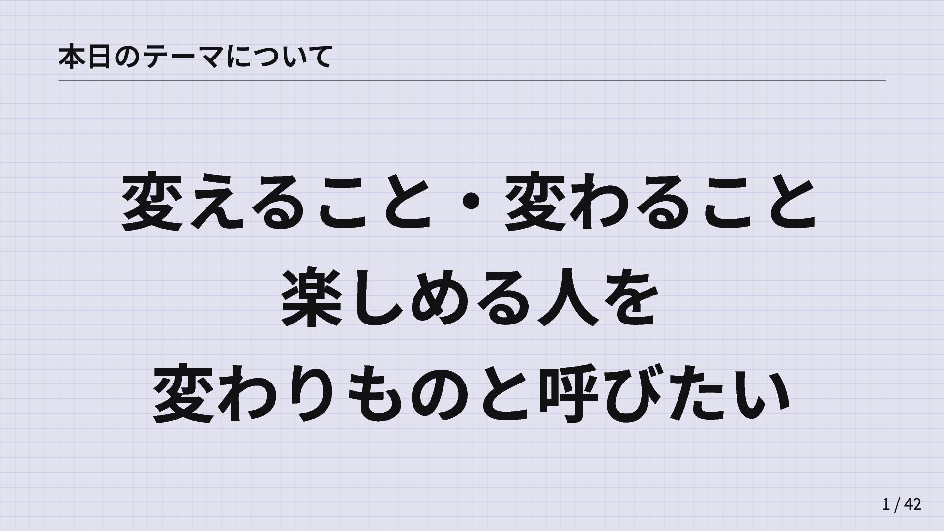 本日のテーマについて 変えること・変わること 楽しめる人を 変わりものと呼びたい 1 / 42