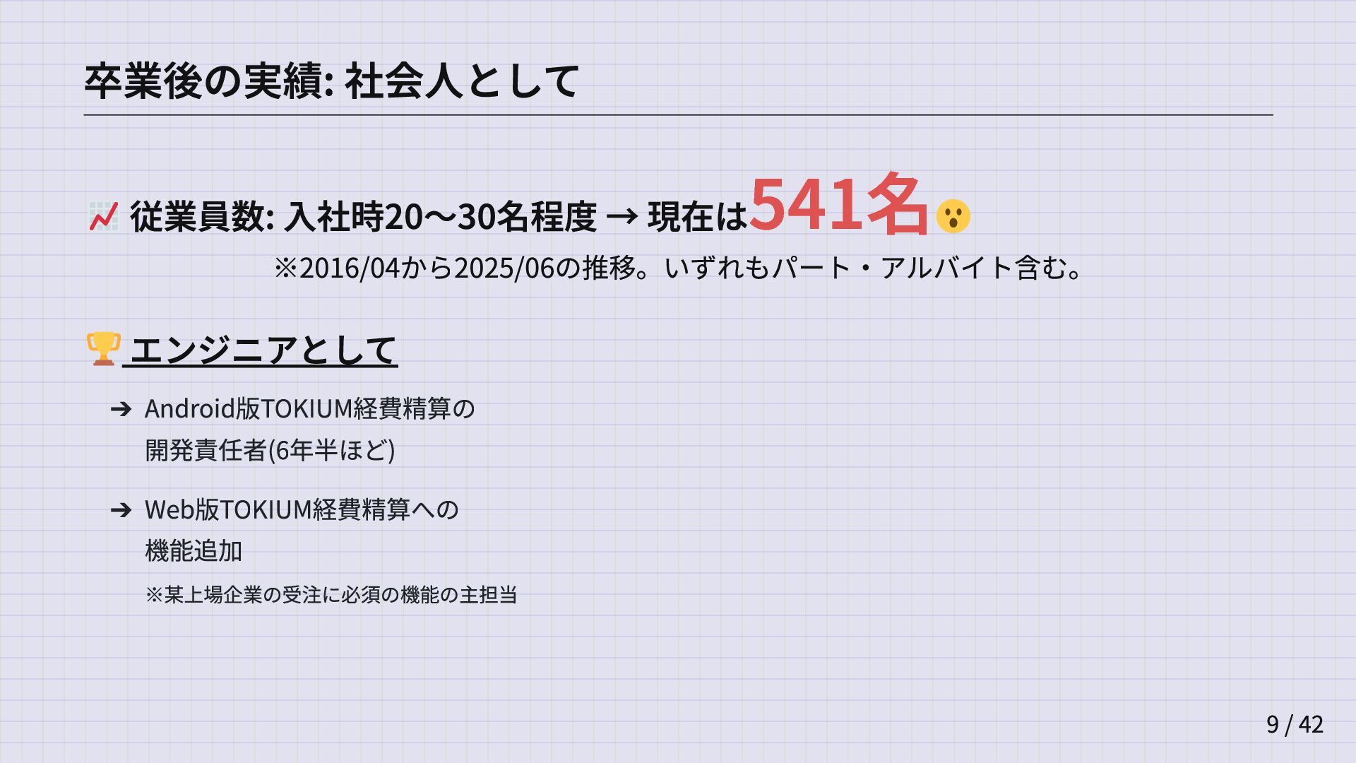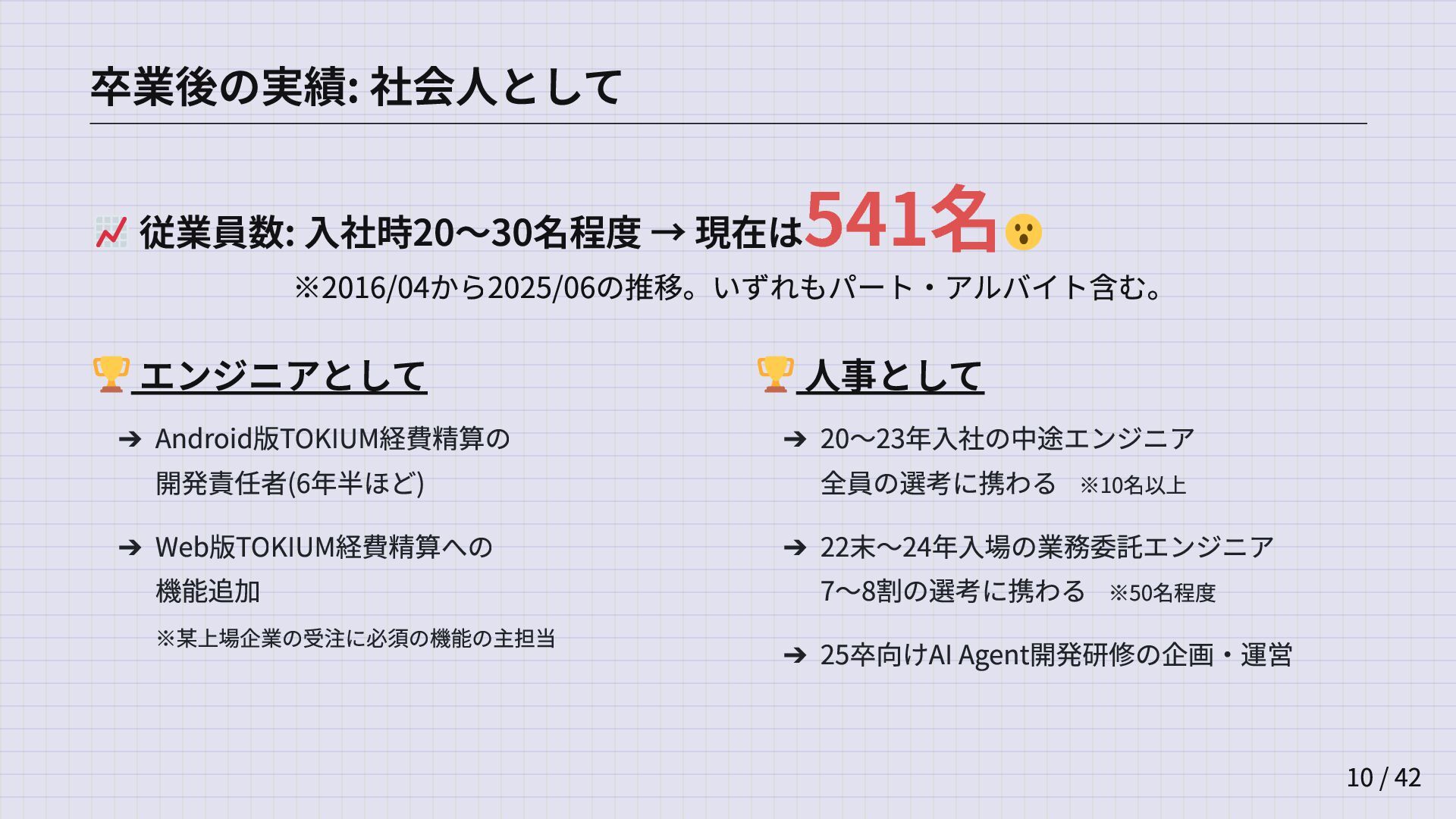 卒業後の実績: 社会人として 従業員数: 入社時20〜30名程度 → 現在は 541名 ※2016/04から2025/06の推移。いずれもパート・アルバイト含む。 エンジニアとして ➔