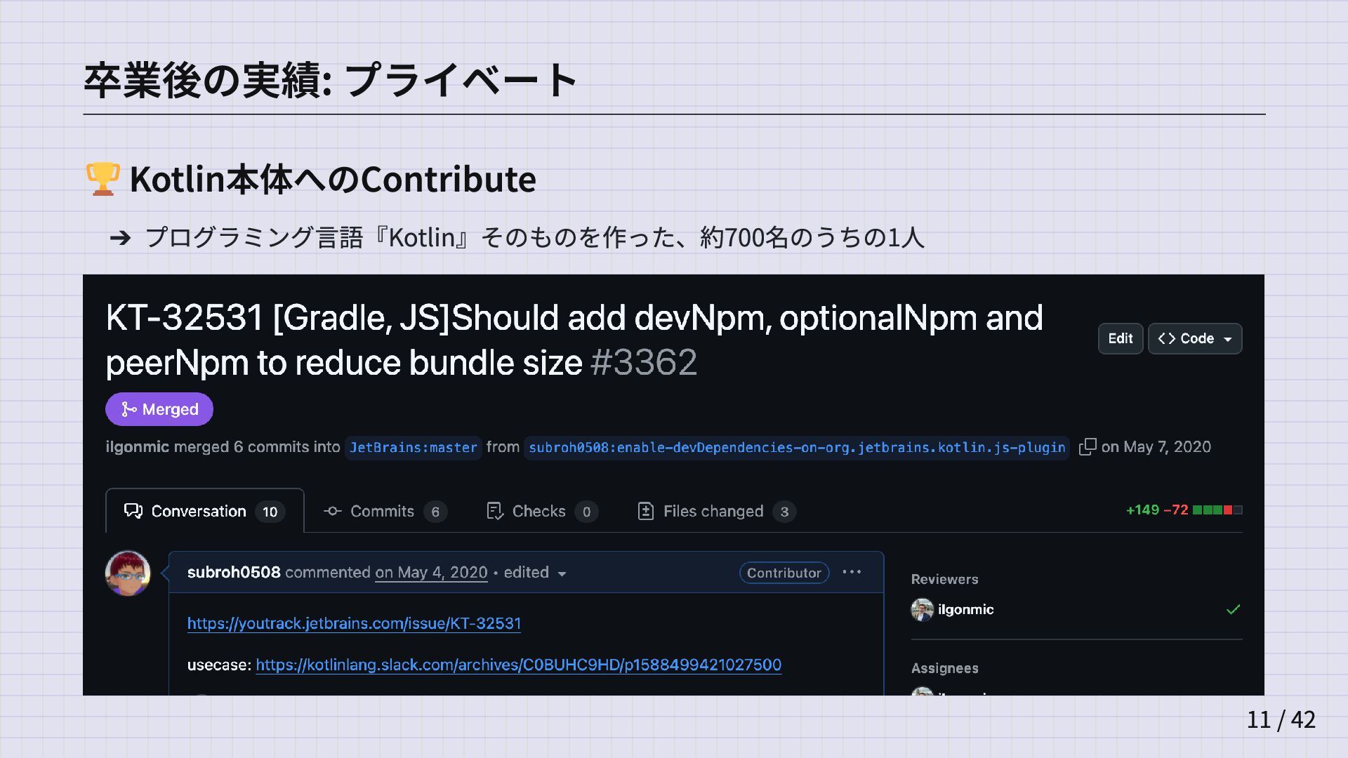 卒業後の実績: プライベート Kotlin本体へのContribute ➔ プログラミング言語『Kotlin』そのものを作った、約700名のうちの1人 11 / 42