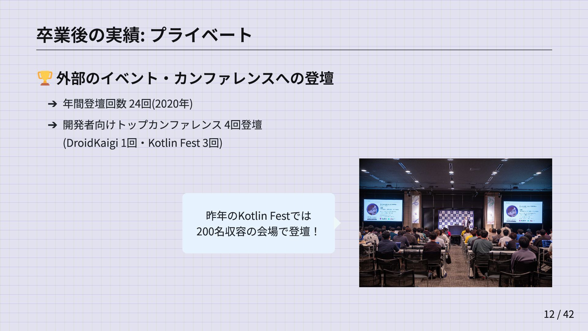 卒業後の実績: プライベート ️ 外部のイベント・カンファレンスへの登壇 ➔ 年間登壇回数 24回(2020年) ➔ 開発者向けトップカンファレンス 4回登壇