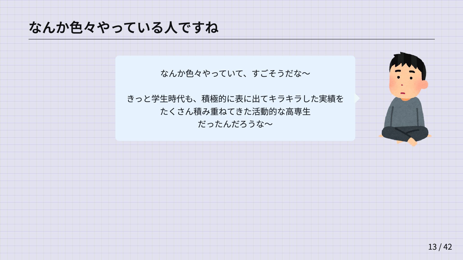 なんか色々やっている人ですね 13 / 42 なんか色々やっていて、すごそうだな〜 きっと学生時代も、積極的に表に出てキラキラした実績を たくさん積み重ねてきた活動的な高専生 だったんだろうな〜