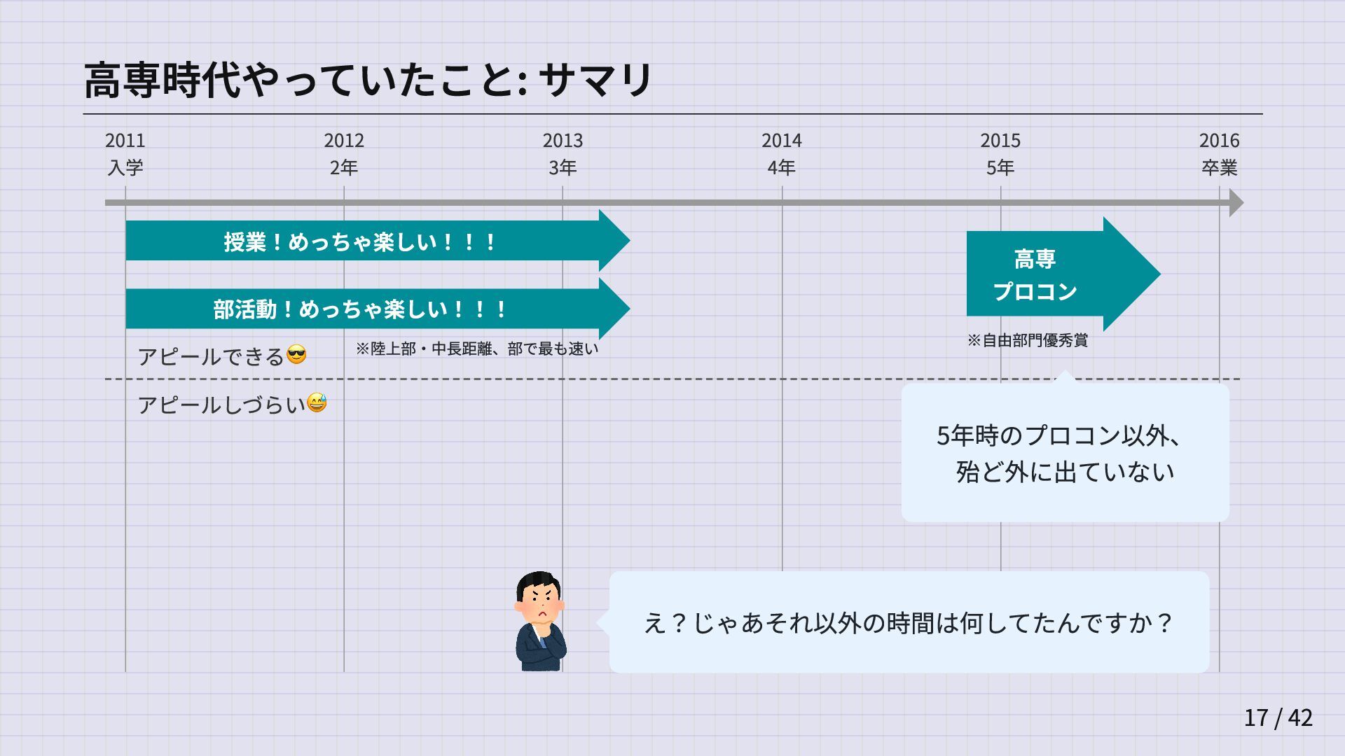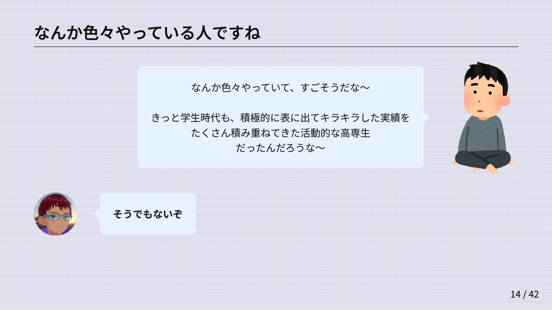 なんか色々やっている人ですね 14 / 42 なんか色々やっていて、すごそうだな〜 きっと学生時代も、積極的に表に出てキラキラした実績を たくさん積み重ねてきた活動的な高専生 だったんだろうな〜 そうでもないぞ