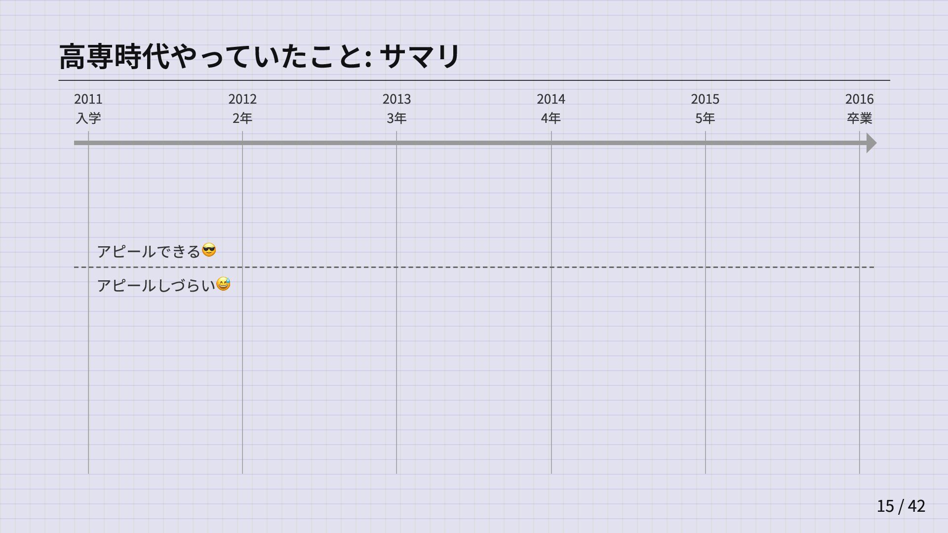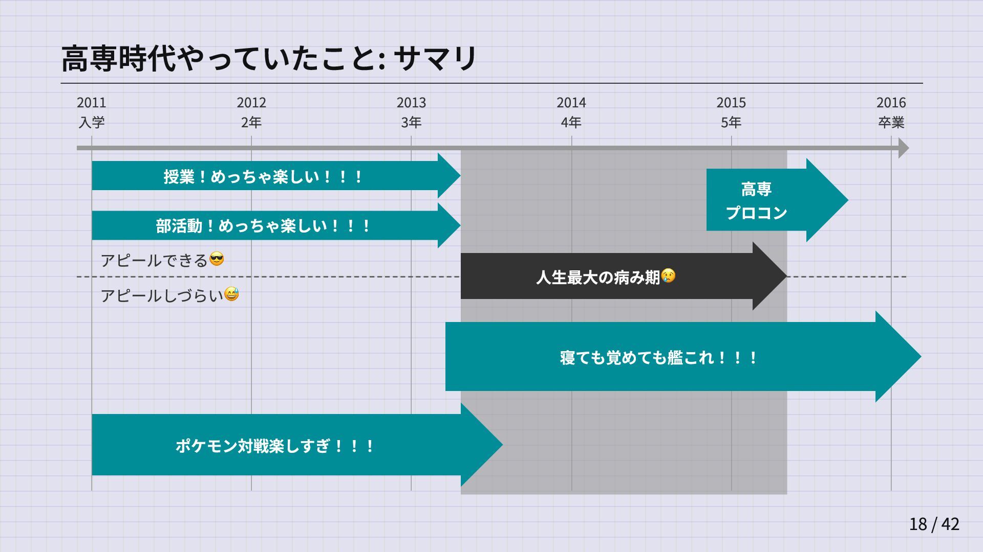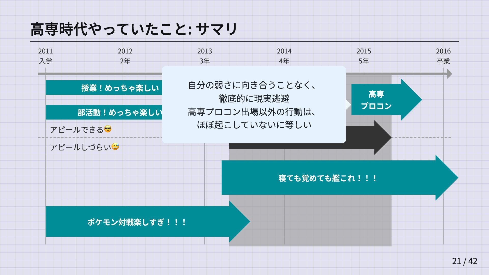 2015 5年 2016 卒業 アピールできる😎 アピールしづらい😅 授業!めっちゃ楽しい!!! 部活動!めっちゃ楽しい!!! 21 / 42 高専 プロコン ポケモン対戦楽しすぎ!!! 人生最大の病み期😢 寝ても覚めても艦これ!!! 自分の弱さに向き合うことなく、 徹底的に現実逃避 高専プロコン出場以外の行動は、 ほぼ起こしていないに等しい