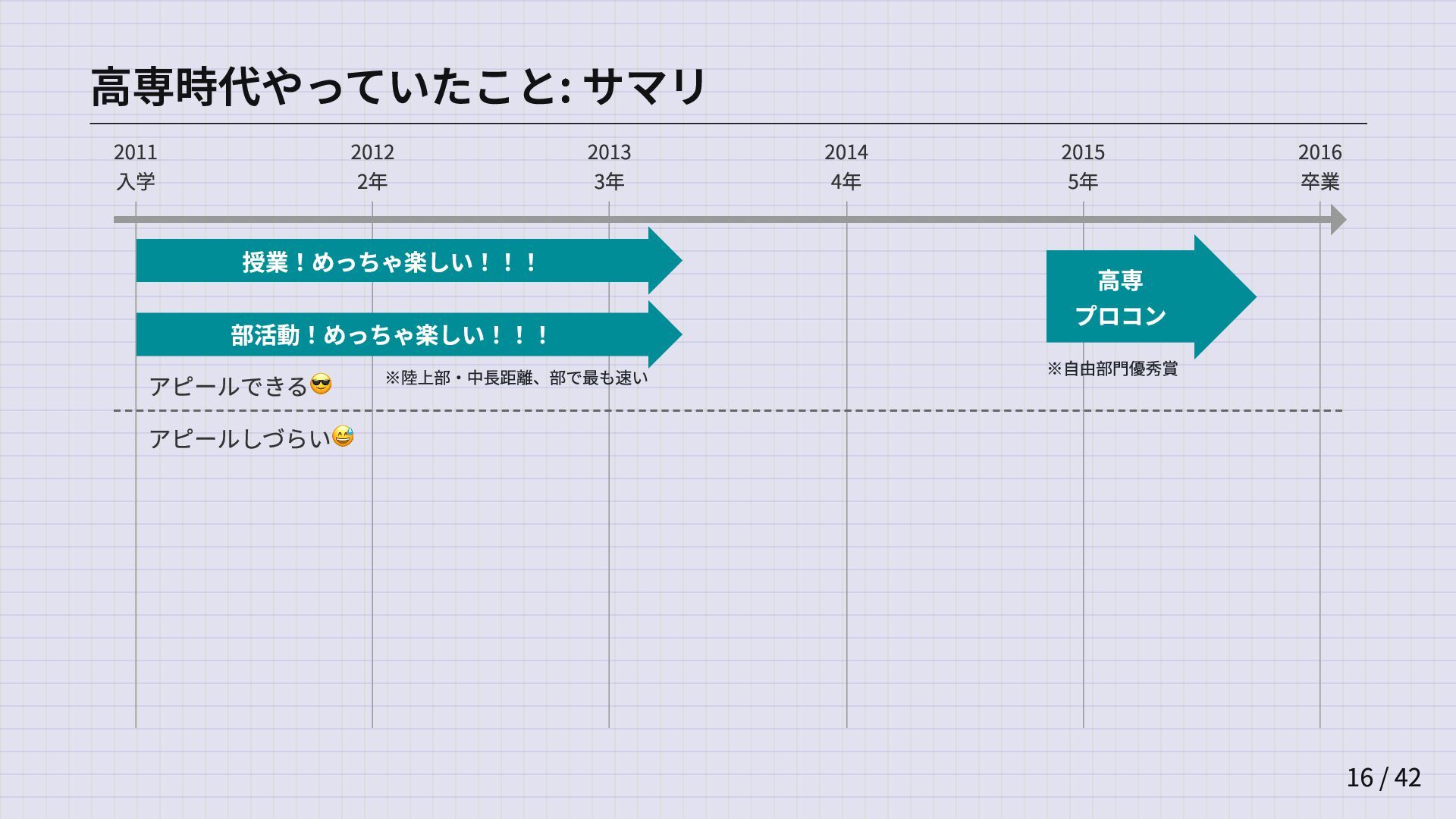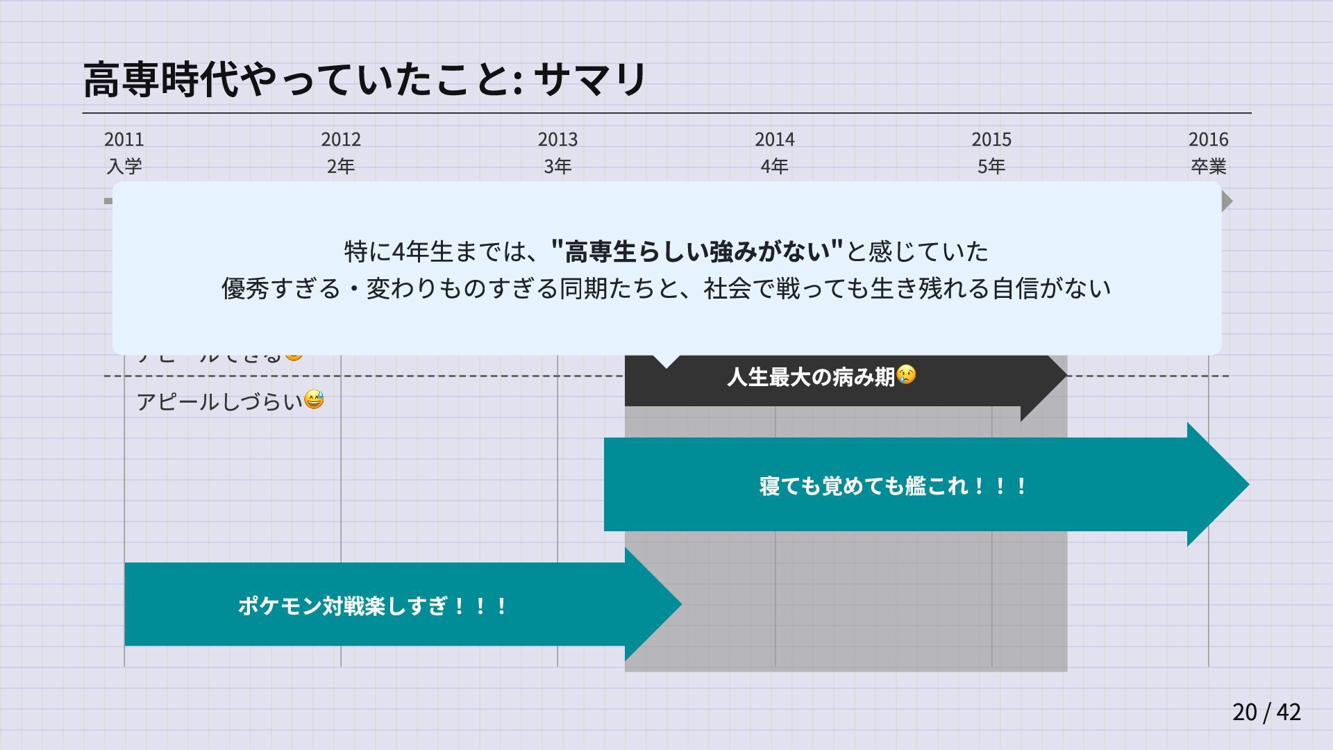 2015 5年 2016 卒業 アピールできる😎 アピールしづらい😅 授業!めっちゃ楽しい!!! 部活動!めっちゃ楽しい!!! 20 / 42 高専 プロコン ポケモン対戦楽しすぎ!!! 人生最大の病み期😢 寝ても覚めても艦これ!!! 特に4年生までは、"高専生らしい強みがない"と感じていた 優秀すぎる・変わりものすぎる同期たちと、社会で戦っても生き残れる自信がない
