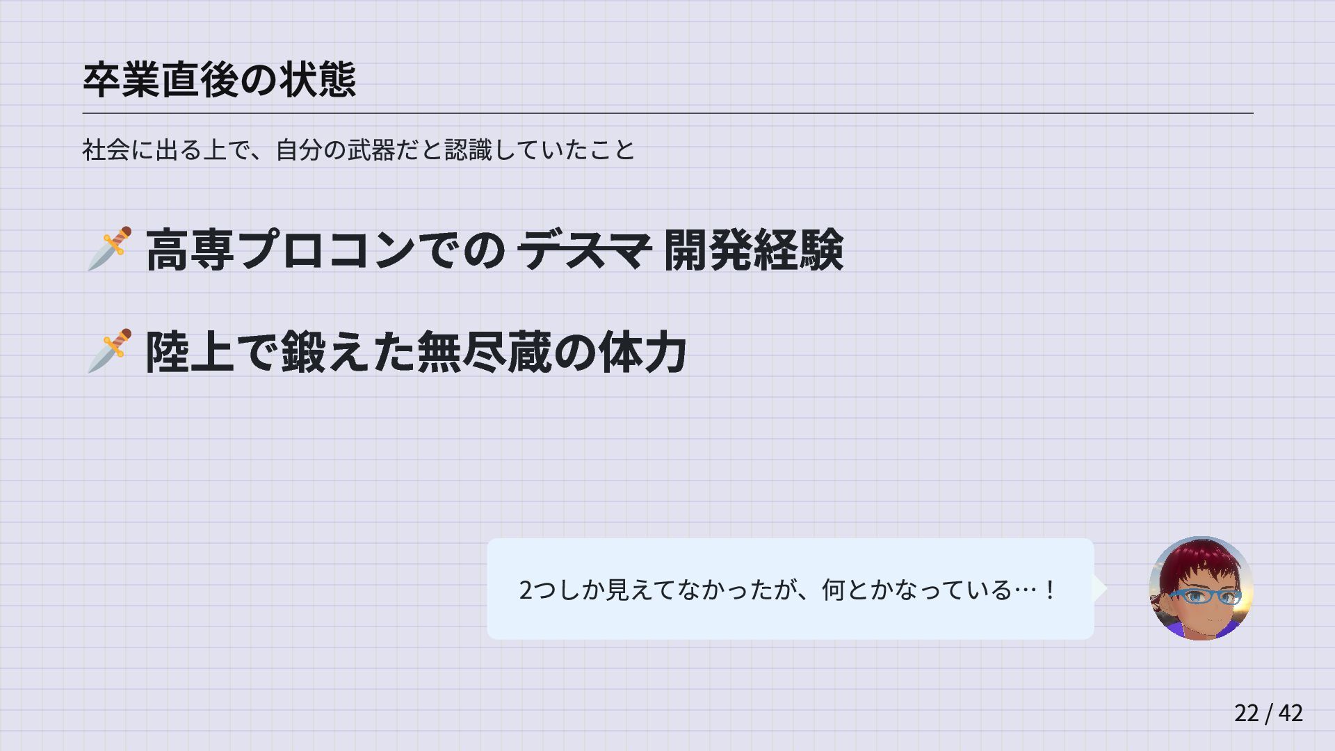 卒業直後の状態 社会に出る上で、自分の武器だと認識していたこと 高専プロコンでの デスマ 開発経験 陸上で鍛えた無尽蔵の体力 22 / 42 2つしか見えてなかったが、何とかなっている…!