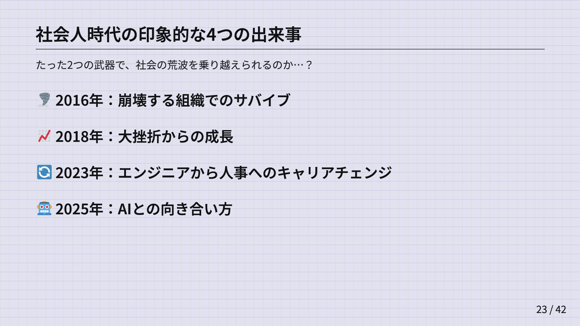 社会人時代の印象的な4つの出来事 たった2つの武器で、社会の荒波を乗り越えられるのか…? 2016年:崩壊する組織でのサバイブ 2018年:大挫折からの成長 2023年:エンジニアから人事へのキャリアチェンジ 2025年:AIとの向き合い方 23 / 42