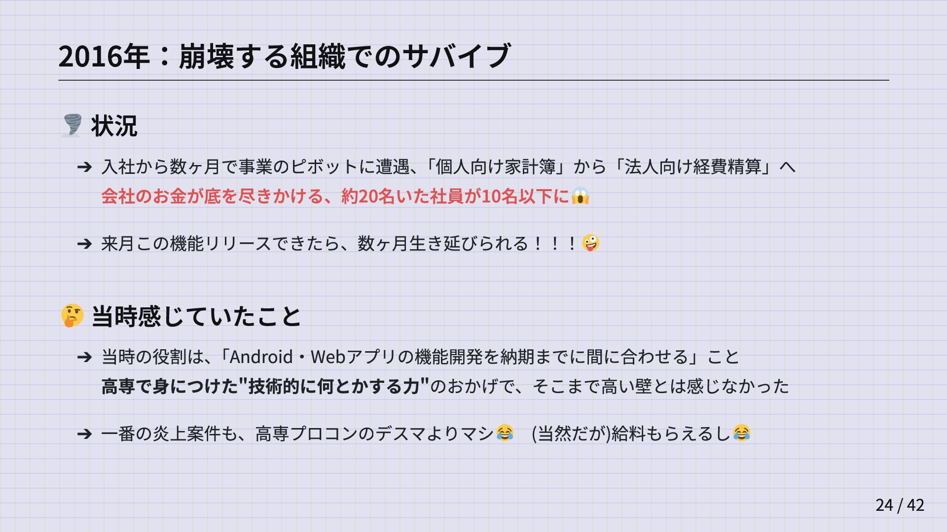 2016年:崩壊する組織でのサバイブ 状況 ➔ 入社から数ヶ月で事業のピボットに遭遇、 「個人向け家計簿」から「法人向け経費精算」へ 会社のお金が底を尽きかける、約20名いた社員が10名以下に ➔ 来月この機能リリースできたら、数ヶ月生き延びられる!!! 当時感じていたこと ➔