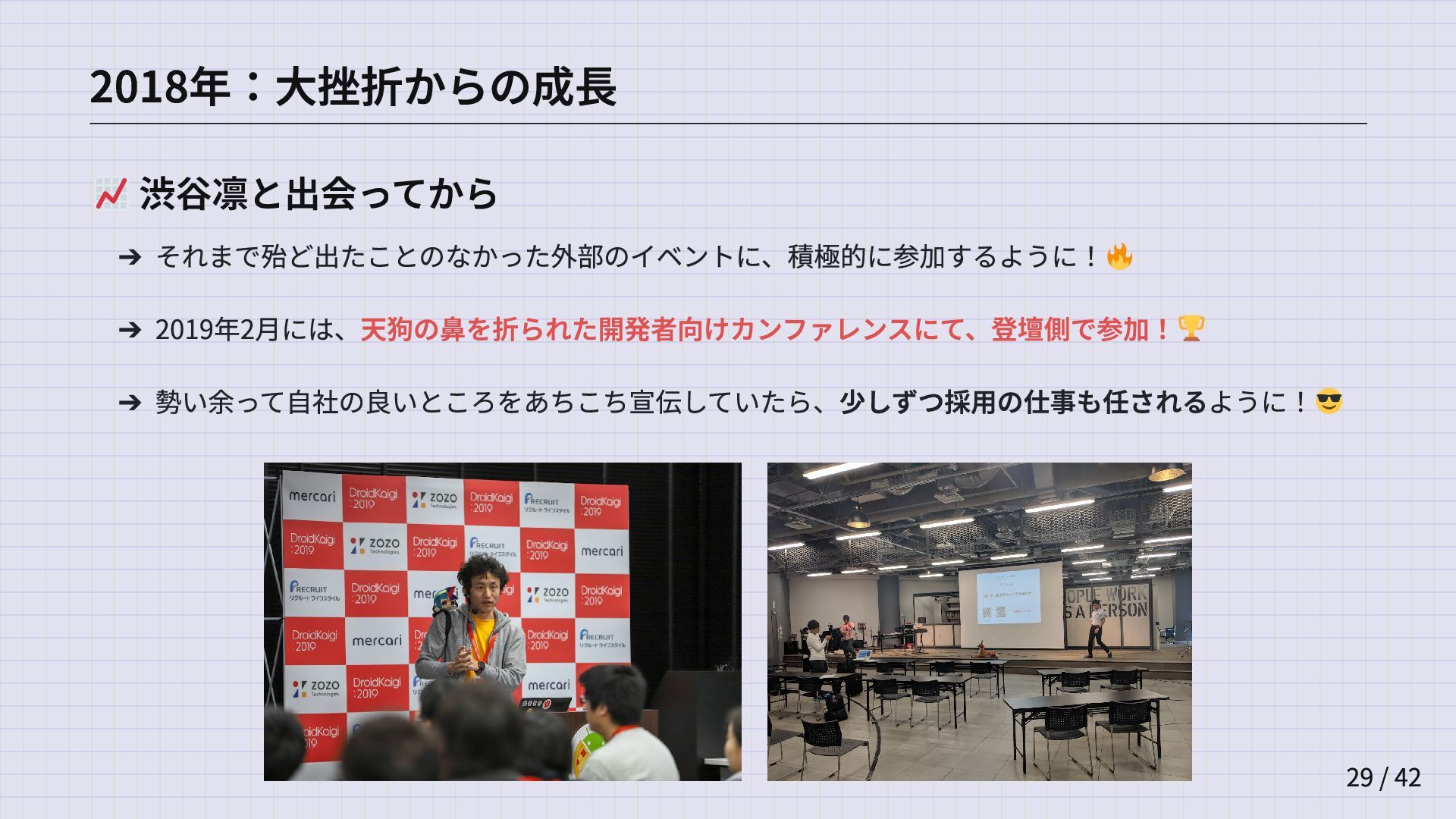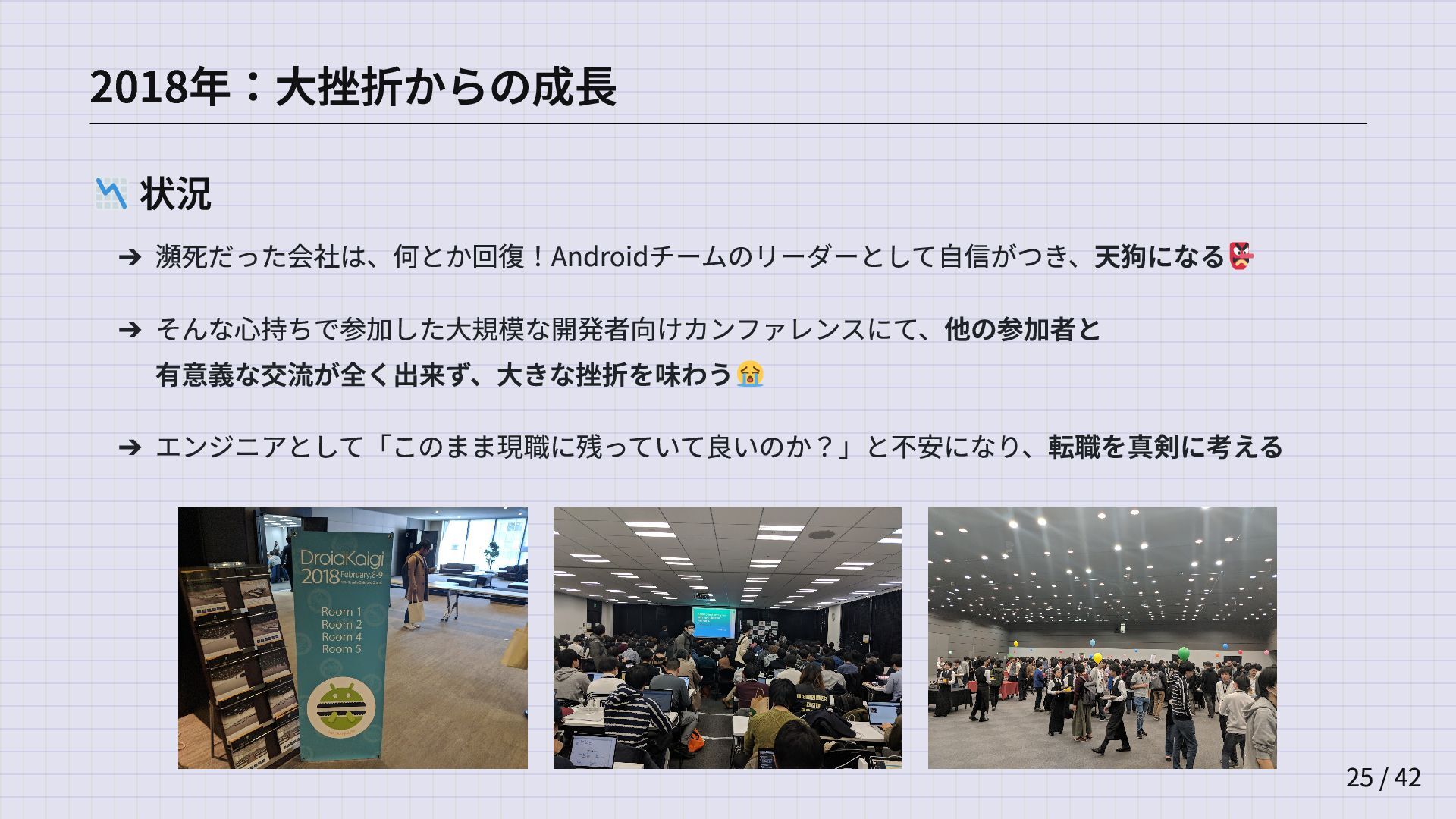 2018年:大挫折からの成長 状況 ➔ 瀕死だった会社は、何とか回復!Androidチームのリーダーとして自信がつき、天狗になる ➔ そんな心持ちで参加した大規模な開発者向けカンファレンスにて、他の参加者と 有意義な交流が全く出来ず、大きな挫折を味わう ➔ エンジニアとして「このまま現職に残っていて良いのか?」と不安になり、転職を真剣に考える 25