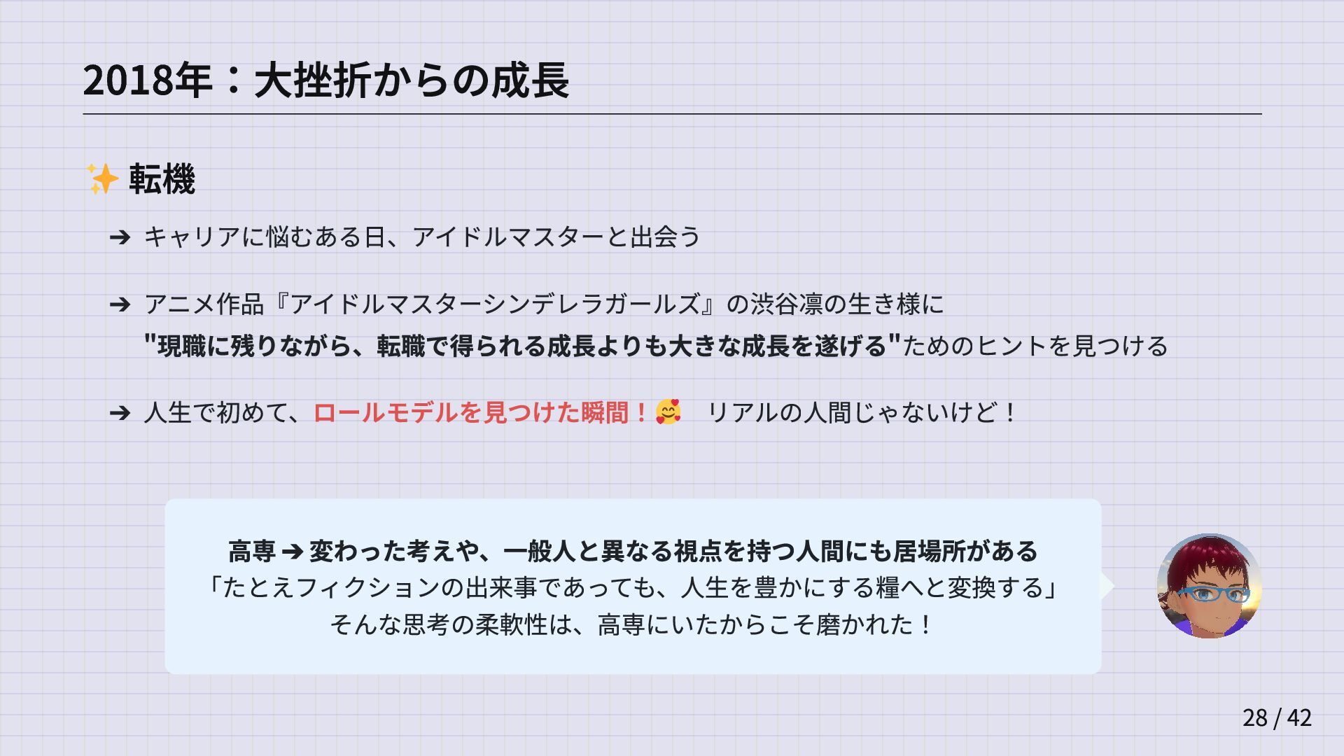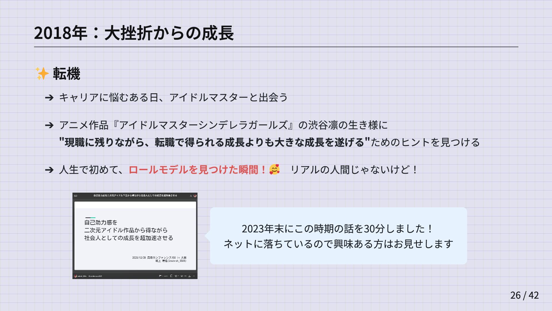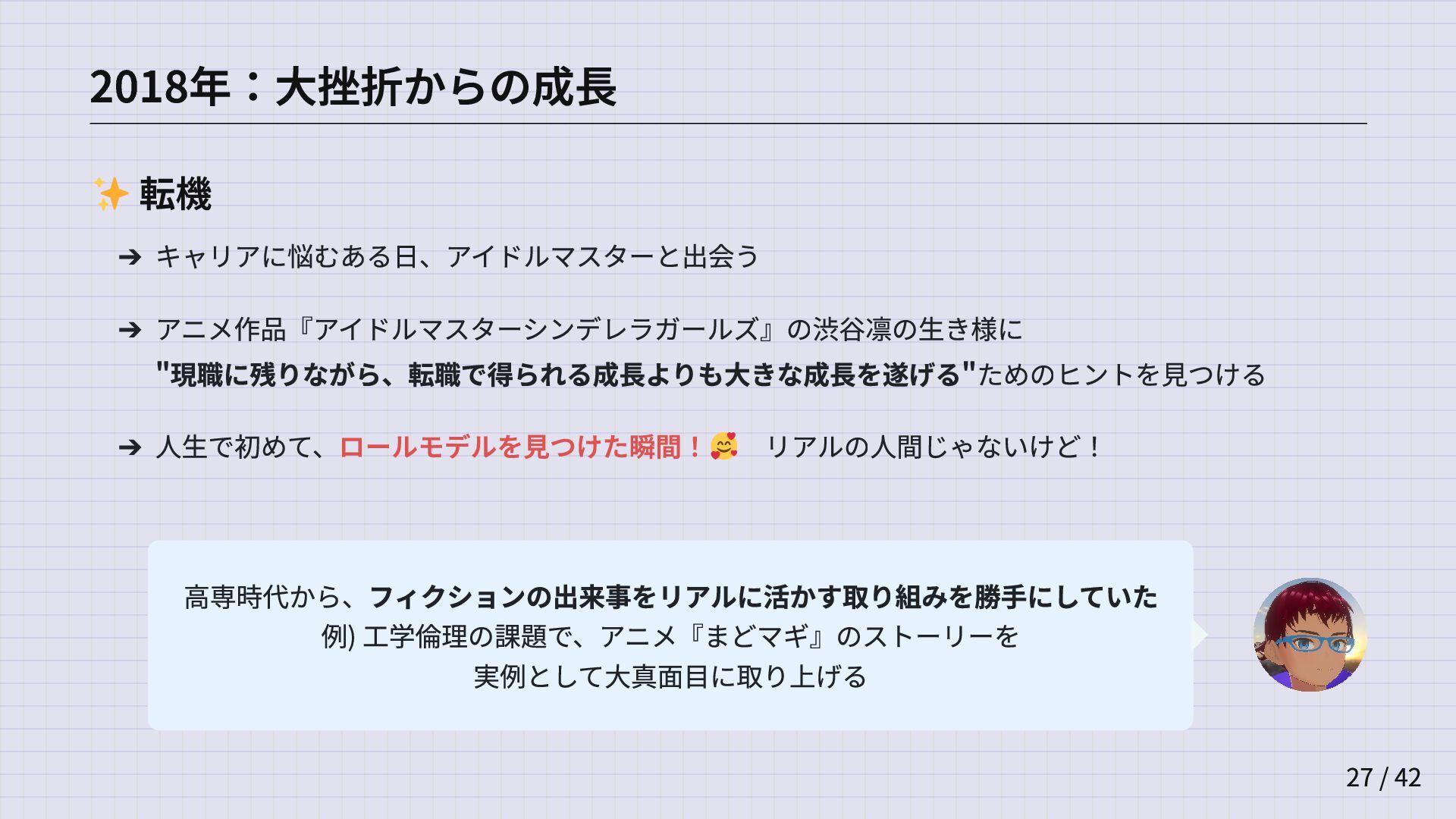 2018年:大挫折からの成長 ️ 転機 ➔ キャリアに悩むある日、アイドルマスターと出会う ➔ アニメ作品『アイドルマスターシンデレラガールズ』の渋谷凛の生き様に "現職に残りながら、転職で得られる成長よりも大きな成長を遂げる"ためのヒントを見つける ➔ 人生で初めて、ロールモデルを見つけた瞬間!